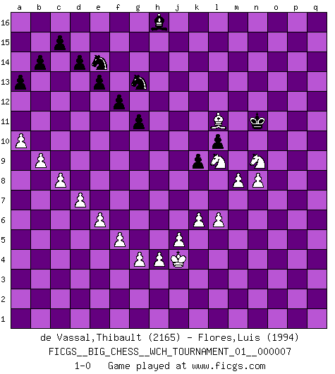 Last move : 1-0 2015 October 15 2:14:29 [Event "FICGS__BIG_CHESS__WCH_TOURNAMENT_01__000007"] [Site "FICGS"] [Date "2014.11.01"] [Round "1"] [White "de Vassal,Thibault"] [Black "Flores,Luis"] [Result "1-0"] [WhiteElo "2165"] [BlackElo "1994"] 1.j2-k4 p16-o14 2.h1-o7 h15-g13 3.h2-g4 j15-k13 4.m2-m4 m15-m13 5.l1-p5 k16-h15 6.p1-o3 b16-c14 7.e2-e4 e15-e13 8.b1-c3 f16-c13 9.n2-n3 d15-d14 10.f1-b5 l16-p12 11.k1-h2 n15-n14 12.o1-f9 o16-g9 13.d2-d3 m16-m14 14.g1-j2 c16-l8 15.c1-l9 m14-l14 16.m1-m3 e16-e14 17.m3-l3 h16-p9 18.l9-n7 p9-n11 19.j2-h4 e14-f14 20.e1-e3 l8-m9 21.o7-k3 l14-l3 22.k3-l3 g16-j15 23.q1-m1 q16-m16 24.l3-k3 a16-e16 25.m1-m3 m16-m14 26.m3-l3 m14-l14 27.l3-l14 j15-l14 28.k3-j4 e16-e14 29.f9-k13 m9-n8 30.h4-k5 n8-k5 31.j4-k5 j14-k13 32.k5-k13 f14-f12 33.n7-l9 n11-n10 34.k13-n10 p12-n10 35.e3-f3 e14-f14 36.f3-f12 f14-f12 37.a1-e1 f12-p12 38.e1-e3 g9-j7 39.l9-j7 c13-j7 40.e3-f3 j7-h8 41.f3-f8 h8-g7 42.f8-f7 g7-l11 43.q2-q4 p12-b12 44.a2-a4 n10-l12 45.f7-f10 l11-h8 46.f10-p10 o14-n12 47.o3-n5 h15-j13 48.e4-e5 g13-h11 49.g4-f6 b12-e12 50.d3-d4 e12-d12 51.c3-e2 d12-g12 52.h2-g4 g12-c12 53.c2-c3 l12-c4 54.b5-c4 c12-c4 55.b2-b3 c4-c12 56.p10-b10 b15-b14 57.f6-d7 g15-g13 58.a4-a5 f15-f13 59.b3-b4 j16-h15 60.p2-p4 c14-d12 61.d7-c5 d12-e14 62.p5-l9 e14-c13 63.o2-o4 a15-a13 64.f2-f3 p15-p14 65.e2-f4 q15-q13 66.f4-g6 h8-k6 67.g4-j5 c12-c9 68.l9-d2 c9-q9 69.q4-q5 h15-j14 70.b4-b5 l14-k12 71.a5-a6 j13-g12 72.c3-c4 k6-m8 73.b10-b8 m8-k10 74.j5-g4 k15-k14 75.g6-e7 l15-l13 76.e7-c6 n12-m14 77.d4-d5 g12-j13 78.c5-e6 m14-o13 79.b8-c8 l13-l12 80.e6-d8 h11-f12 81.e5-e6 k14-k13 82.c6-e7 k12-h11 83.d8-f9 f12-e14 84.d2-e3 f13-f12 85.f3-f4 k13-k12 86.f4-f5 k12-k11 87.g4-j5 k10-e5 88.j1-j2 e5-g3 89.j5-l6 q9-g9 90.k4-h5 g3-e5 91.g2-g4 e5-a9 92.p4-p5 a9-d12 93.e3-k8 g9-q9 94.q5-q6 h14-h13 95.k8-j7 d12-a9 96.b5-b6 g13-g12 97.c4-c5 a9-b10 98.d5-d6 b10-a11 99.j7-h6 a11-b10 100.c5-c6 g12-g11 101.a6-a7 j13-g12 102.b6-b7 q9-j9 103.h6-g7 j9-j10 104.l6-k8 j10-j12 105.k8-m9 j12-j10 106.m9-l11 j10-j13 107.l11-n10 j13-j10 108.n10-m12 o13-m12 109.g7-m12 g12-j13 110.c8-o8 j13-l14 111.m12-g7 l14-m16 112.g7-f8 h11-j13 113.f8-n15 j13-l14 114.n15-q12 b10-c11 115.l2-l3 c11-h6 116.a7-a8 j14-k13 117.o8-h8 h6-d2 118.h8-h13 k13-j14 119.h13-h8 p14-p13 120.q12-n9 q13-q12 121.b7-b8 d2-b4 122.n9-g3 b4-c3 123.h8-h16 j14-j15 124.h16-h7 c3-n13 125.h7-j7 j10-j7 126.h5-j7 l14-j13 127.c6-c7 n13-m14 128.a8-a9 j15-j14 129.j7-g8 j14-h13 130.b8-b9 j13-g12 131.c7-c8 m14-n15 132.n5-o7 g12-j11 133.o4-o5 h13-h12 134.n3-n4 o15-o13 135.p5-p6 n15-o14 136.n4-n5 j11-k9 137.d6-d7 m16-l14 138.o5-o6 k9-m10 139.q6-q7 o14-n15 140.e7-d9 m10-l8 141.p6-p7 l14-j13 142.q7-q8 p13-p12 143.o7-n9 l8-n9 144.g3-n9 q12-q11 145.q8-q9 n15-m14 146.p7-p8 j13-h11 147.o6-o7 h11-k12 148.n9-m8 h12-j12 149.n5-n6 k12-l10 150.m8-l7 l10-n11 151.m4-m5 n11-m9 152.l7-m6 m9-k10 153.l3-l4 k10-l8 154.m6-k8 l8-k6 155.k2-k3 k6-h7 156.k8-l9 h7-k6 157.g8-h6 j12-h11 158.j2-k2 h11-g10 159.f9-g7 k6-h7 160.h6-k7 h7-g9 161.k7-j9 g10-h10 162.j9-g8 h10-h11 163.l9-k10 g9-j10 164.g7-j8 h11-j12 165.k10-n7 j10-k8 166.j3-j4 k8-j10 167.k2-j3 j10-h8 168.j8-l7 h8-j10 169.j4-j5 j10-h8 170.j3-j4 h8-j10 171.k3-k4 j10-h8 172.k4-k5 h8-j10 173.l4-l5 j10-h8 174.g8-j7 h8-j10 175.j7-l8 j12-h13 176.l8-n9 h13-j12 177.l7-m9 m14-l13 178.p8-p9 l13-m14 179.m9-o8 j10-l11 180.n9-p8 l11-k9 181.k5-k6 k9-m10 182.o8-n10 m14-n13 183.p9-p10 q11-p10 184.q9-p10 m10-o9 185.n7-m6 o9-m10 186.l5-l6 m10-n12 187.m6-q10 p12-p11 188.q10-n7 j12-k13 189.n7-l9 k13-l14 190.p8-n7 m13-m12 191.n7-o9 m12-m11 192.n10-m8 l12-l11 193.d9-f8 n13-m14 194.f8-g10 o13-o12 195.l9-j11 m14-l15 196.o9-p7 n14-n13 197.n6-n7 l15-k14 198.m5-m6 l14-m13 199.o7-o8 k14-m12 200.m6-m7 m13-l12 201.o8-o9 l11-l10 202.n7-n8 m12-q8 203.p7-n6 q8-m12 204.n6-l7 k11-k10 205.h3-h4 l12-k11 206.j11-d6 k10-k9 207.a9-a10 n12-m10 208.d6-g9 m10-l12 209.g9-h8 m12-k14 210.m8-k7 k11-k12 211.l7-j6 k12-l13 212.j6-k8 l13-m13 213.k8-j10 m13-n14 214.k7-l9 n13-n12 215.j10-l11 n14-o13 216.l9-k11 o12-o11 217.p10-o11 n12-o11 218.h8-j7 c13-e12 219.g10-h12 p11-p10 220.o9-p10 o11-p10 221.h12-j10 l12-n13 222.l11-m13 k14-h16 223.m13-n11 o13-n12 224.n11-p10 e12-f10 225.p10-n9 f10-g8 226.j7-g5 g8-f10 227.k11-m10 n12-m12 228.g5-f6 m12-n11 229.f6-n13 n11-m10 230.m7-m8 f10-h11 231.n13-l11 m10-n10 232.j10-l9 n10-n11 233.n9-m11 h11-g13 234.m11-n9 1-0 Follow this game move after move (download)Only sissies Castle. (Rob Sillars) Im Fernschach kannst du während dem Spiel rauchen. (John Christen Knudsen) El arma más poderosa en el Ajedrez, es tener la próxima movida. (David Bronstein) Il n'y a plus de joueurs du niveau de Jacob Murray dont la seule quête est le beau jeu, le plaisir de voir les pièces construire quelque chose. Sur 10 idées à la minute, 9 seront sans intérêt, la dernière s'avèrera géniale. (Christian Bauer) No man has ever achieved immortality in his own life time. (Unknown)