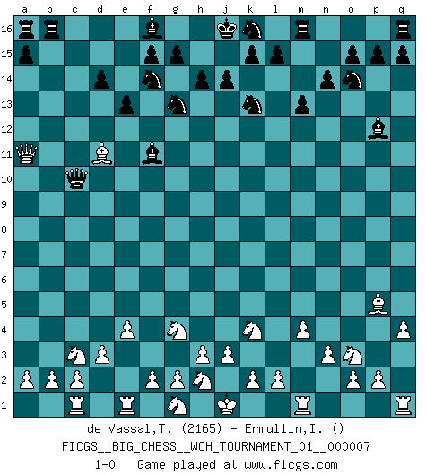 Last move : 1-0 2014 December 31 15:25:9 [Event "FICGS__BIG_CHESS__WCH_TOURNAMENT_01__000007"] [Site "FICGS"] [Date "2014.11.01"] [Round "1"] [White "de Vassal,Thibault"] [Black "Ermullin,Igor"] [Result "1-0"] [WhiteElo "2165"] [BlackElo ""] 1.j2-k4 h15-g13 2.h1-o7 p16-o14 3.h2-g4 j15-k13 4.m2-m4 m15-m13 5.p1-o3 l16-p12 6.k1-h2 e15-e13 7.l1-p5 n15-n14 8.e2-e4 d15-d14 9.b1-c3 o16-l13 10.f1-b5 c16-g12 11.d2-d3 g12-h13 12.o7-o9 l13-n11 13.o9-b9 h16-h15 14.b9-b15 b16-d15 15.b15-c15 n11-c1 16.a1-c1 d15-c13 17.c15-a13 h15-c10 18.n2-n3 h13-d9 19.b5-f9 d9-f11 20.q2-q4 g16-f14 21.a13-a11 e16-b16 22.f9-d11 c13-d11 23.o1-d11 1-0 Follow this game move after move (download)A man that will take back a move at Chess will pick a pocket. (Richard Fenton) Computer sind die einzigen Gegner, die nicht immer eine Ausrede auf Lager haben, wenn sie gegen mich verlieren. (Robert James Fischer) Fischer es una tragedia del Ajedrez Americano a la par con Morphy y Pillsbury. (Mig Greengard) Echiquier : carré parfait, comme la Jérusalem nouvelle décrite par l'auteur de l'Apocalypse, huit cases sur huit, exaltation du chiffre 4, symbole du cosmos aux quatre horizons... où le noir et le blanc, l'ombre et la lumière, le mal et le bien s'entremêlent et se conjuguent. (Robert Couffignal, Le Gambit du poète) Inventor: A person who makes an ingenious arrangement of wheels, levers and springs, and believes it civilization. (Ambrose Bierce, The Devil's Dictionary)