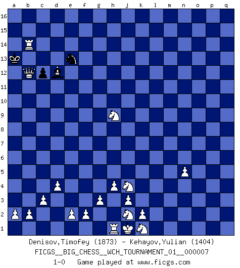 Last move : 1-0 2015 July 9 6:15:18 [Event "FICGS__BIG_CHESS__WCH_TOURNAMENT_01__000007"] [Site "FICGS"] [Date "2014.11.01"] [Round "1"] [White "Denisov,Timofey"] [Black "Kehayov,Yulian"] [Result "1-0"] [WhiteElo "1873"] [BlackElo "1404"] 1.n2-n4 j15-k13 2.g2-g3 h15-g13 3.h1-a8 h16-h15 4.o1-d11 g15-g14 5.d2-d4 n15-n13 6.c1-k8 d15-d13 7.d11-f9 g16-j15 8.a8-d5 m15-m13 9.d5-d13 b16-c14 10.h3-h4 e15-e13 11.d13-h9 p16-o14 12.f1-j4 o16-j11 13.c2-c3 f16-c13 14.m2-m4 j11-g9 15.g1-h3 g9-m4 16.l1-n3 m4-n3 17.o2-n3 c13-n3 18.p1-o3 l16-o13 19.m1-m6 m13-m12 20.q1-m1 c16-k9 21.m6-j6 k9-b1 22.a1-b1 o13-b1 23.e1-b1 n3-d12 24.h9-o15 m16-p16 25.o15-h9 h15-g15 26.m1-m10 g15-f14 27.m10-j10 k16-h15 28.f9-g8 f14-f12 29.k8-f12 e13-f12 30.j4-h5 h15-j13 31.h9-b9 a16-b16 32.b1-h1 k13-h12 33.j10-l10 l15-l14 34.g8-p16 q16-p16 35.b9-h9 j16-h15 36.h9-h12 c14-e13 37.j6-j13 h15-g15 38.j13-n13 c15-c13 39.h12-m12 g15-h15 40.m12-f12 g13-f11 41.n13-n9 b15-b14 42.n9-h9 j15-h13 43.f12-k8 e16-k16 44.l10-k10 k15-k13 45.h3-j5 o14-m13 46.j5-h7 p15-p14 47.o3-n5 g14-g13 48.n5-m7 q15-q13 49.m7-l9 p14-p13 50.h5-q13 p13-p12 51.k8-l8 p12-p11 52.l8-a8 h15-g15 53.q13-k7 p11-p10 54.l9-j10 p10-p9 55.k10-q10 p9-p8 56.q10-q15 g15-f14 57.q15-q8 p8-p7 58.a8-h15 k16-j16 59.h15-h14 f14-e15 60.q8-a8 a15-a13 61.h9-j9 p7-p6 62.a8-l8 m13-l15 63.l8-l14 f15-f14 64.l14-l15 e15-e14 65.h14-o8 p6-p5 66.l15-l7 p5-p4 67.o8-j8 e14-f13 68.j10-k8 p4-p3 69.q2-p3 p16-p3 70.j9-j14 j16-j14 71.j8-j14 b16-h16 72.j14-k13 p3-p2 73.k13-o9 h13-f12 74.o9-b9 f13-e14 75.b9-b14 e14-f13 76.k7-h9 f11-h12 77.b14-a13 h16-o16 78.a13-a8 f13-e14 79.l7-l14 o16-o2 80.n4-n5 o2-l2 81.a8-a14 e14-f13 82.l14-f14 f13-g12 83.h9-p2 l2-p2 84.a14-c16 g12-f11 85.c16-b15 f11-g12 86.b15-p2 g12-g11 87.k8-h9 g11-f11 88.p2-j8 f11-g12 89.j8-g8 g12-f11 90.g8-g13 h12-g10 91.h7-f8 g10-f8 92.f14-f12 f11-e11 93.f12-f8 e11-d11 94.g13-g8 d11-e12 95.h2-j4 e12-d13 96.g8-g16 d13-c14 97.f8-f14 c14-b13 98.g16-b11 b13-a13 99.f14-b14 c13-c12 100.b11-b12 1-0 Follow this game move after move (download)You cannot play at Chess if you are kind-hearted. (French Proverb) Ich spiele ehrlich und spiele, um zu gewinnen. Wenn ich verliere nehme ich meine Medizin. (Robert James Fischer) Los tropiezos estan todos ahí en el tablero, esperando que se cometan. (Savielly Tartakover) La solitude du joueur d'Echecs à l'approche du mat est semblable à celle du condamné. (Francis Szpiner) Opportunities multiply as they are seized. (Sun Tzu)