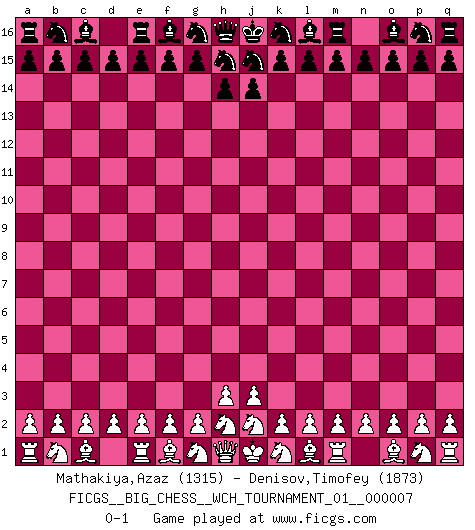 Last move : 0-1 2014 November 3 8:25:21 [Event "FICGS__BIG_CHESS__WCH_TOURNAMENT_01__000007"] [Site "FICGS"] [Date "2014.11.01"] [Round "1"] [White "Mathakiya,Azaz"] [Black "Denisov,Timofey"] [Result "0-1"] [WhiteElo "1315"] [BlackElo "1873"] 0-1 Follow this game move after move (download)We don't really know how the game was invented, though there are suspicions. As soon as we discover the culprits, we'll let you know. (Bruce Pandolfini) Die jungen Leute sollen verstehen, dass sie noch etwas von mir lernen können und müssen. (Viktor Kortschnoi) Existen dos clases de sacrificios: los correctos y los míos. (Mikhail Tal) Le temps de noter son nom sur la feuille de partie, j'étais déjà en zeitnot ! D'un modeste amateur apparié lors de la première ronde d'un open contre le grand-maître Azmaïparashvili. In God we trust, all others we virus scan. (Anonymous)