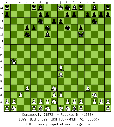 Last move : 1-0 2015 March 17 1:58:45 [Event "FICGS__BIG_CHESS__WCH_TOURNAMENT_01__000007"] [Site "FICGS"] [Date "2014.11.01"] [Round "1"] [White "Denisov,Timofey"] [Black "Ropokis,Dimitrios"] [Result "1-0"] [WhiteElo "1873"] [BlackElo "1239"] 1.n2-n4 h15-g13 2.d2-d4 j15-k13 3.p1-o3 b16-c14 4.o1-j6 g16-f14 5.j2-h4 p16-o14 6.h1-p8 h16-m12 7.c2-c3 d15-d13 8.c1-j7 m15-m13 9.p8-k8 c16-g12 10.k8-c15 e15-e13 11.c15-b15 c14-d12 12.b15-b8 1-0 This big chess game has been lost on time (started : 2014.11.01 23:6:27) Follow this game move after move (download)A bad plan is better than none at all. (Frank Marshall) Gegen einen Schachcomputer zu verlieren ist wie Löcher in den Strümpfen zuhaben. Es ist nicht peinlich, solange man der einzige ist der es weiß. (Anonymous) Bobby solo arroja las piezas y solas caen en las casillas correctas. (Miguel Najdorf ) 'L'échange des dames est un coup dur pour les deux adversaires...' Un journaliste lors d'une partie du match Spassky-Fischer May I never be complete. May I never be content. May I never be perfect. Deliver me, Tyler, from being perfect and complete. (Chuck Palahniuk, Fight Club)