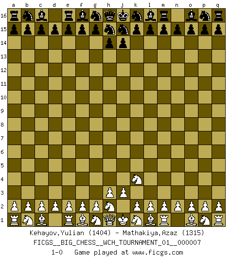Last move : 1-0 2014 November 3 12:54:48 [Event "FICGS__BIG_CHESS__WCH_TOURNAMENT_01__000007"] [Site "FICGS"] [Date "2014.11.01"] [Round "1"] [White "Kehayov,Yulian"] [Black "Mathakiya,Azaz"] [Result "1-0"] [WhiteElo "1404"] [BlackElo "1315"] 1.j2-k4 1-0 Follow this game move after move (download)The laws of Chess do not permit a free choice: you have to move whether you like it or not. (Emanuel Lasker) Taktik ist was man tun muß, wenn etwas zu tun ist. Strategie ist was man tun muß, wenn nichts zu tun ist. (Savielly Grigorievitsch Tartakower) Tu cuerpo tiene que estar en óptima condición. Tu Ajedrez se deteriora como lo hace tu cuerpo. No puedes separar la mente y el cuerpo. (Bobby Fischer) Les Echecs, c'est l'art de la guerre sans les charniers, c'est la résurrection des morts tombés au champ d'honneur, l'espoir perpétuel, la suprématie de l'intelligence sur la force, la culture de l'esprit. (F. Szpiner) Bobby never cared about money, though. His only desire was to prove that his choices were correct: He wanted chess to be important because he was a chess player, and he wanted to be important. Bobby knew money was important, but he didn't have a clue why, outside of clothes and status. The only way he could accomplish what he wanted was to fight for a lot of money. Once he got it, he gave it away. He did not know how to spend it. And once he'd become champion, after, essentially, sacrificing his life for it, he didn't know how to spend his time. (Bob Wade)