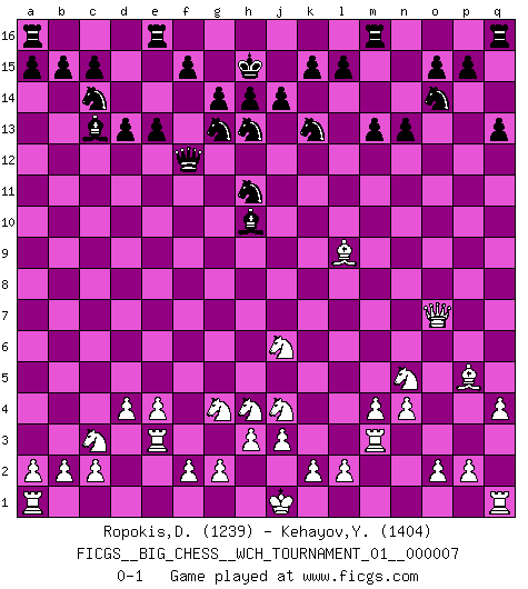 Last move : 0-1 2015 March 4 0:16:55 [Event "FICGS__BIG_CHESS__WCH_TOURNAMENT_01__000007"] [Site "FICGS"] [Date "2014.11.01"] [Round "1"] [White "Ropokis,Dimitrios"] [Black "Kehayov,Yulian"] [Result "0-1"] [WhiteElo "1239"] [BlackElo "1404"] 1.j2-k4 h15-g13 2.p1-o3 j15-k13 3.b1-c3 e15-e13 4.h2-g4 d15-d13 5.m2-m4 m15-m13 6.h1-o7 n15-n13 7.l1-p5 k16-h15 8.k1-l3 p16-o14 9.e2-e4 b16-c14 10.f1-b5 g16-j15 11.n2-n4 g15-g14 12.d2-d4 l16-p12 13.o1-j6 p12-j6 14.k4-j6 h16-f14 15.c1-l9 f14-f12 16.g1-f3 o16-h10 17.q2-q4 q15-q13 18.o3-n5 f16-c13 19.m1-m3 c16-h11 20.b5-h11 g13-h11 21.l3-j4 h15-g13 22.f3-h4 j15-h13 23.e1-e3 j16-h15 0-1 This big chess game has been lost on time (started : 2014.11.01 23:6:27) Follow this game move after move (download)It is always better to sacrifice your opponent's men. (Savielly Tartakower) Er war ein guter Schachspieler, aber ich kann Leute nicht ausstehen, die 'Heil Hitler' rufen (Über Alexander Aljechin). (Miguel Najdorf) Sin errores no puede haber brillantez. (Emanuel Lasker) Vous savez, camarade Pachman, je n'éprouve pas de plaisir à être ministre, je jouerais plutôt aux échecs comme vous, ou alors ferais une révolution au Venezuela. (Che Guevara à Ludek Pachman, 'Checkmate in Prague', 1975) That's absurd. I love it. (Gregory House, House M.D.)