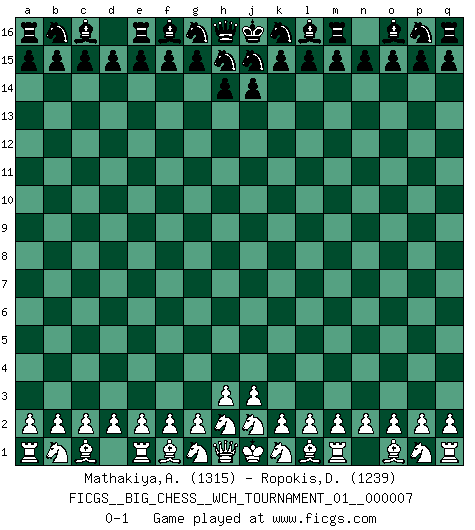 Last move : 0-1 2014 November 3 8:17:0 [Event "FICGS__BIG_CHESS__WCH_TOURNAMENT_01__000007"] [Site "FICGS"] [Date "2014.11.01"] [Round "1"] [White "Mathakiya,Azaz"] [Black "Ropokis,Dimitrios"] [Result "0-1"] [WhiteElo "1315"] [BlackElo "1239"] 0-1 Follow this game move after move (download)If you aren't afraid of Spassky, then I have removed the element of money. (Jim Slater) Das Schachspiel übertrifft alle anderen Spiele so weit wie der Chimborasso einen Misthaufen. (Arthur Schopenhauer) Un sacrificio se refuta mucho mejor al aceptarlo. (Wilhelm Steinitz) Le jeu d'échecs fait naître et fortifie en nous plusieurs qualités précieuses dans le cours de l'existence, telles que la prévoyance, la circonspection, la prudence, et la persévérance. (Benjamin Franklin - 1783, la morale des échecs) Kids, you tried your best and you failed miserably. The lesson is, never try. (Simpsons)