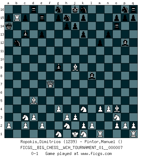 Last move : 0-1 2015 February 25 18:19:34 [Event "FICGS__BIG_CHESS__WCH_TOURNAMENT_01__000007"] [Site "FICGS"] [Date "2014.11.01"] [Round "1"] [White "Ropokis,Dimitrios"] [Black "Pintor,Manuel"] [Result "0-1"] [WhiteElo "1239"] [BlackElo ""] 1.j2-k4 j15-k13 2.p1-o3 m15-m13 3.b1-c3 l16-p12 4.g2-g4 e15-e13 5.h1-c6 b16-c14 6.d2-d3 n15-n13 7.n2-n4 o16-g9 8.m2-m4 d15-d13 9.l1-n3 f16-c13 10.c1-k8 h16-o10 11.o1-f9 o10-f2 12.f1-g2 f2-f8 13.n3-o4 m16-m14 14.e1-f1 f8-b8 15.k8-h10 m14-o14 16.g2-d5 l15-l14 17.h10-j9 m13-m12 18.f9-k13 l14-k13 19.c6-p6 c16-l8 20.p6-f15 e16-e15 21.f15-d13 a16-d16 22.d13-h9 b8-b2 23.a1-b1 b2-a3 24.b1-b3 a3-a7 25.b3-b7 a7-a14 26.f1-f9 a14-f9 27.b7-b15 c14-b12 28.h9-f7 f9-a14 0-1 Follow this game move after move (download)Bobby is the finest Chess player this country ever produced. His memory for the moves, his brilliance in dreaming up combinations, and his fierce determination to win are uncanny. (John Collins) Schon mancher Spieler hat aufgegeben, um zu vermeiden, daß er eine Figur verliert. (Savielly Grigorievitsch Tartakower) En el Ajedrez, tal como en la vida, las bendiciones de hoy pueden ser el veneno del mañana. (Assaic) Les Echecs mettent en conflit, non pas deux intelligences, mais deux volontés. (Lasker) Computers are like Old Testament gods; lots of rules and no mercy. (Joseph Campbell)