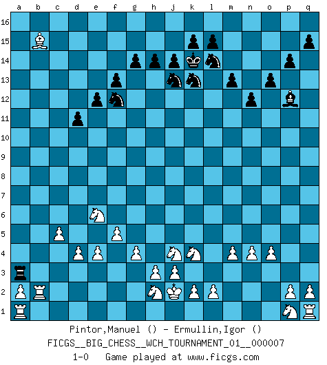 Last move : 1-0 2015 January 7 18:35:4 [Event "FICGS__BIG_CHESS__WCH_TOURNAMENT_01__000007"] [Site "FICGS"] [Date "2014.11.01"] [Round "1"] [White "Pintor,Manuel"] [Black "Ermullin,Igor"] [Result "1-0"] [WhiteElo ""] [BlackElo ""] 1.m2-m4 m15-m13 2.j2-k4 h15-g13 3.g2-g4 j15-k13 4.h1-a8 h16-h15 5.f1-g2 h15-a8 6.g2-a8 j16-j15 7.d2-d4 l16-o13 8.e2-e4 n15-n13 9.c1-k8 e15-e13 10.f2-f4 o16-l13 11.l1-o4 d15-d14 12.g1-f3 c16-k9 13.b1-d2 b16-c14 14.f3-g5 g15-g14 15.h2-j4 f15-f13 16.e1-e3 d14-d13 17.n2-n4 f16-d14 18.e3-b3 b15-b14 19.o1-b13 g16-e15 20.a8-d11 e13-e12 21.b13-c14 e15-c14 22.d11-b13 k9-j10 23.c2-c4 e16-e15 24.k8-d14 e15-e14 25.b13-c14 e14-d14 26.c14-a16 c15-c14 27.o4-d14 k16-h15 28.a16-c14 m16-c16 29.c14-a12 j10-c4 30.d2-c4 c16-c4 31.d14-j9 o15-o14 32.b3-c3 c4-c3 33.b2-c3 p16-n15 34.c3-c4 q16-c16 35.c4-c5 c16-c9 36.j9-b16 a15-a14 37.b16-f12 c9-f9 38.f12-b8 l13-m12 39.a1-d1 h15-j13 40.a12-c14 d13-d12 41.f4-f5 f9-f8 42.b8-d6 f8-c8 43.c14-b15 n15-l14 44.b15-a14 d12-d11 45.a14-b15 g13-e14 46.d6-o16 p15-p14 47.o16-p15 n13-n12 48.g5-e6 o13-p12 49.d1-b1 m12-h8 50.k1-h2 o14-o13 51.p15-h8 c8-h8 52.b1-b14 e14-f12 53.o2-o4 h8-a8 54.b14-b2 a8-a3 55.j1-j2 j15-k14 56.m1-a1 1-0 Follow this game move after move (download)Chess is mental torture. (Garry Kasparov) Wer mein Gambit spielt, muß bereit sein, alle Brücken hinter sich abzubrechen. Es verändert den ganzen Menschen. Es wirkt wie ein Zauberstab und fördert verkümmerte, gute Charakter- eigenschaften wieder zu Tage. (Emil Joseph Diemer) Me gusta decir que Bobby Fischer fue el mejor jugador que jamás haya existido. Pero lo que hizo de Fischer un genio, fue su habilidad de mezclar una frescura y pragmatismo Americano con ideas Rusas acerca de la estrategia. (Bruce Pandolfini) Les écrivains ont utilisé les échecs pour analyser les côtés extrêmes de la nature humaine. Dans ce cadre, les échecs offrent un champ d'expérimentation idéal. Mais on pourrait faire la même chose avec la peinture. Et là, en vous référant à Van Gogh, vous ne tirerez pas de conclusion définitive sur les peintres. (Gary Kasparov) It is not enough to be a good player... you must also play well. (Siegbert Tarrasch)