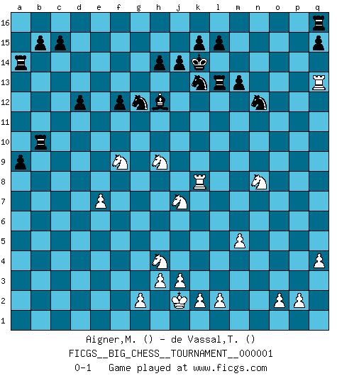 Last move : 0-1 2007 March 23 17:55:6 [Event "FICGS__BIG_CHESS__TOURNAMENT__000001"] [Site "FICGS"] [Date "2007.02.26"] [Round "1"] [White "Aigner,Michael"] [Black "de Vassal,Thibault"] [Result "0-1"] [WhiteElo ""] [BlackElo ""] 1.m2-m4 j15-h13 2.n2-n4 h16-o10 3.l1-n3 o10-f2 4.g1-f3 f2-n9 5.p1-o3 n9-n4 6.o1-m3 n4-p4 7.k1-m2 m15-m13 8.d2-d4 g16-f14 9.b1-c3 b16-c14 10.c1-g5 p16-o14 11.e2-e4 k16-l14 12.f1-c4 n15-n13 13.e4-e5 l16-o13 14.c3-e4 d15-d13 15.c4-h9 h13-j11 16.o3-n5 p4-p7 17.j2-k4 j11-h9 18.h1-m5 h9-f8 19.m2-l4 c16-k9 20.e4-f6 e15-e13 21.c2-c4 a16-d16 22.a1-c1 f16-c13 23.e5-e6 f14-g12 24.f3-h4 c14-d12 25.e6-e7 f8-h7 26.f6-h7 k9-h7 27.e1-e6 h15-j13 28.q2-q4 e16-e14 29.q1-q3 d16-d14 30.c1-f1 f15-f13 31.f1-f7 p7-l11 32.g5-f6 l11-k11 33.f7-h7 k11-e6 34.h7-h6 e6-e1 35.j1-j2 e1-m1 36.q3-o3 m1-c1 37.f6-g5 c1-c4 38.o3-o13 c4-a2 39.l4-k6 a2-b2 40.n3-q6 b2-d4 41.m3-f9 g12-e11 42.f9-l14 j13-l14 43.k6-j8 d14-b14 44.h6-g6 e11-g12 45.m5-m8 c13-e15 46.g5-l9 o16-j11 47.m8-k8 b14-b1 48.h2-j4 l14-m12 49.o13-o7 m16-m14 50.n5-l6 d4-d1 51.j4-g3 j11-l9 52.j8-l9 d1-m9 53.l9-n8 m9-q9 54.l6-n5 o14-n12 55.m4-m5 e15-j11 56.o7-o15 j11-h10 57.k8-m8 h10-j11 58.m8-j8 b1-b11 59.j8-d13 m14-l14 60.q6-n3 b11-b14 61.n3-d12 e13-d12 62.g6-b6 e14-d14 63.d13-g16 j16-j15 64.g16-g15 j15-k14 65.b6-k6 m12-k13 66.n5-l6 q9-n9 67.k6-k8 n9-e9 68.g3-h5 e9-e15 69.g15-e15 j11-e15 70.o15-p15 a15-a13 71.p15-n15 a13-a12 72.n15-n13 l14-l13 73.h5-g7 b14-b10 74.g7-f9 e15-h12 75.k4-j6 a12-a11 76.j6-g7 a11-a10 77.g7-h9 f13-f12 78.l6-j7 a10-a9 79.n13-q13 d14-a14 0-1 Follow this game move after move (download)If your opponent offers you a draw, try to work out why he thinks he's worse off. (Nigel Short) Das Zentrum ist der Balkan des Schachbretts - Kriegshandlungen können in jedem Moment ausbrechen. (Aaron Nimzowitsch) El Ajedrez es un cuento de Hadas de las 1001 metidas de pata. (Savielly Tartakower) J'ai vu le vaincu d'Echecs jouer des années durant dans l'espoir de la fête de la victoire. Car tu es plus riche de ce qu'elle existe si même elle n'est point pour toi. Ainsi de la perle du fond des mers. (Antoine de Saint-Exupéry) Humor is by far the most significant activity of the human brain. (Edward De Bono)