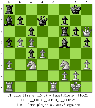 Last move : 1-0 2014 December 30 14:56:5 [Event "FICGS__CHESS__RAPID_C__000121"] [Site "FICGS"] [Date "2014.11.03"] [Round "1"] [White "Cirulis,Ilmars"] [Black "Faust,Dieter"] [Result "1-0"] [WhiteElo "1679"] [BlackElo "1662"] 1.b4 e5 2.a3 Nf6 3.Bb2 a5 4.b5 Bc5 5.c4 d6 6.e3 Nbd7 7.d4 exd4 8.exd4 Ba7 9.Qe2+ Kf8 10.Nf3 g6 11.Qd1 Kg7 12.Be2 Re8 13.Nc3 Nb6 14.O-O Bg4 15.Bc1 c6 16.h3 Bf5 17.Bg5 h6 18.Be3 d5 19.c5 Nc4 20.Bxc4 dxc4 21.Qc1 h5 22.Bh6+ Kg8 23.Bg5 Re6 24.Re1 Qd7 25.Bxf6 Rxf6 26.Qh6 1-0 Polish (Sokolsky) opening Kingside Castling by player White (move 14) Player White won this chess game. Follow this game move after move (download)Spassky will not be psyched out by Fischer. (Mike Goodall) Ich liebe den Moment, wenn ich das Ego meines Gegenüber breche. (Robert James Fischer) Si no le temes a Spassky, entonces elimino el elemento del dinero. (Jim Slater) On entre au jeu d'Echecs comme on entre en Religion. Pour le joueur d'Echecs, la partie d'Echecs c'est l'office, la messe, le défilé du 1er Mai, le dépôt de gerbe au Monument aux Morts. C'est un drame sacré. (Michel Roos) All politicians must be presumed guilty until they are proven innocent. (Dinesh De Silva)