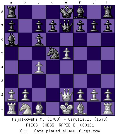 Last move : 0-1 2014 December 16 14:1:20 [Event "FICGS__CHESS__RAPID_C__000121"] [Site "FICGS"] [Date "2014.11.03"] [Round "1"] [White "Fijalkowski,Marek"] [Black "Cirulis,Ilmars"] [Result "0-1"] [WhiteElo "1700"] [BlackElo "1679"] 1.e4 e5 2.Nf3 Nc6 3.d4 exd4 4.Nxd4 Nf6 5.Nxc6 bxc6 6.e5 Qe7 7.Qe2 Nd5 8.c4 Ba6 0-1 This chess game has been lost on time (started : 2014.11.03 3:25:45) Scotch : Mieses variation Player Black won this chess game. Follow this game move after move (download)The boy (then a 12 year old boy named Anatoly Karpov) doesn't have a clue about Chess, and there's no future at all for him in this profession. (Mikhail Botvinnik) Wir irren allesamt, nur jeder irrt anders. (Georg Christoph Lichtenberg) Prefiero perder una partida realmente buena, que ganar una mala. (David Levy) Votre prénom est 'Tactique', votre deuxième prénom est 'Tactique' et votre nom est 'Tactique'. (Ken Smith) To send light into the darkness of men's hearts - such is the duty of the artist. (Schumann)