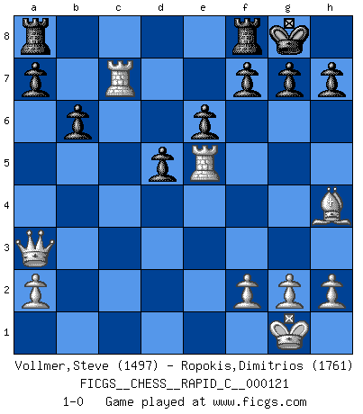 Last move : 1-0 2015 January 4 23:21:54 [Event "FICGS__CHESS__RAPID_C__000121"] [Site "FICGS"] [Date "2014.11.03"] [Round "1"] [White "Vollmer,Steve"] [Black "Ropokis,Dimitrios"] [Result "1-0"] [WhiteElo "1497"] [BlackElo "1761"] 1.d4 b6 2.e4 Bb7 3.Nc3 Nf6 4.Nf3 Nxe4 5.Nxe4 Bxe4 6.Bd3 Bxd3 7.Qxd3 d5 8.Bf4 e6 9.O-O Bd6 10.Bg3 Nd7 11.Bh4 Qc8 12.Rfe1 O-O 13.Rad1 c6 14.Ne5 c5 15.c3 cxd4 16.cxd4 Bxe5 17.dxe5 Qc5 18.Rc1 Qb4 19.Qg3 Qxb2 20.Rc7 Qa3 21.Qxa3 Nxe5 22.Rxe5 1-0 Queen's pawn : English defense Kingside Castling by player White (move 9) Kingside Castling by player Black (move 12) Player White won this chess game. Follow this game move after move (download)It's always better to sacrifice your opponent's men. (Savielly Tartakover) Versuche, dich von der Sklaverei der Eröffnungsvarianten zu befreien. Stattdessen soll man gewisse Typenpositionen erlernen, die man eingehend analysiert. (Aaron Nimzowitsch) En el Ajedrez, tal como en la vida, las bendiciones de hoy pueden ser el veneno del mañana. (Assaic) Mais l'homme est une créature légère et illogique : semblable au joueur d'échecs, il n'aime que le processus du but à atteindre, non le but lui-même. (Dostoïevsky) History is a gallery of pictures in which there are few originals and many copies. (Alexis de Tocqueville)