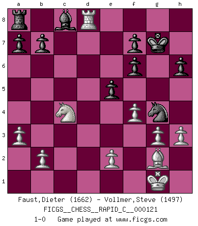 Last move : 1-0 2015 January 31 22:30:56 [Event "FICGS__CHESS__RAPID_C__000121"] [Site "FICGS"] [Date "2014.11.03"] [Round "1"] [White "Faust,Dieter"] [Black "Vollmer,Steve"] [Result "1-0"] [WhiteElo "1662"] [BlackElo "1497"] 1.d4 d5 2.c4 e6 3.Nf3 Nf6 4.g3 Bb4+ 5.Nbd2 O-O 6.Bg2 c5 7.a3 Bxd2+ 8.Qxd2 dxc4 9.dxc5 Qe7 10.Qd6 Qxd6 11.cxd6 Rd8 12.Ne5 Rxd6 13.Nxc4 Rd8 14.Bg5 Nc6 15.O-O h6 16.Bxf6 gxf6 17.Rfd1 Bd7 18.Nd6 Bc8 19.Rac1 Ne5 20.f4 Ng4 21.Nc4 Rxd1+ 22.Rxd1 e5 23.Rd8+ Kg7 24.h3 1-0 Queen's gambit declined Kingside Castling by player Black (move 5) Kingside Castling by player White (move 15) Player White won this chess game. Follow this game move after move (download)By playing at Chess then, we may learn: First: Foresight... Second: Circumspection... Third: Caution... And lastly, we learn by Chess the habit of not being discouraged by present bad appearances in the state of our affairs, the habit of hoping for a favorable chance, and that of persevering in the secrets of resources. (Benjamin Franklin) Ein Teil des Fehlers ist immer korrekt. (Savielly Grigorievitsch Tartakower) Dejen al perfeccionista jugar por correo. (Yasser Seirawan) Shah mat. Le roi est mort. Cri de fierté d'un joueur venant de terrasser son adversaire, courtoisement, sans effusion de sang. No, no, you're not thinking; you're just being logical. (Niels Bohr)