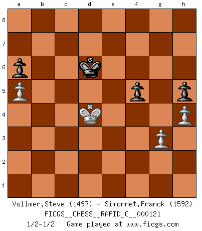 Last move : 1/2-1/2 2014 December 30 12:33:56 [Event "FICGS__CHESS__RAPID_C__000121"] [Site "FICGS"] [Date "2014.11.03"] [Round "1"] [White "Vollmer,Steve"] [Black "Simonnet,Franck"] [Result "1/2-1/2"] [WhiteElo "1497"] [BlackElo "1592"] 1.Nf3 d5 2.d4 e6 3.g3 Nf6 4.Bg2 b5 5.O-O Bb7 6.a4 b4 7.Nbd2 Bd6 8.c4 bxc3 9.bxc3 c5 10.Bb2 O-O 11.c4 Nbd7 12.dxc5 Nxc5 13.Ne5 Rb8 14.Qc2 Qc7 15.Nd3 Nce4 16.Bxf6 gxf6 17.Rfc1 Rfc8 18.Nxe4 dxe4 19.Ne1 f5 20.f4 Qc5+ 21.Kh1 Qf2 22.Bh3 Ba6 23.Qc3 Qxe2 24.Rab1 Rxb1 25.Rxb1 Qxc4 26.Qf6 Bf8 27.Rd1 Qc7 28.Bxf5 exf5 29.Qxa6 e3 30.Rb1 Qc6+ 31.Qxc6 Rxc6 32.Nf3 Bd6 33.Nd4 Rc5 34.Re1 Rd5 35.Nc2 Bc5 36.Nxe3 Bxe3 37.Rxe3 Rd4 38.a5 Rd5 39.Re5 Rxe5 40.fxe5 f6 41.exf6 Kf7 42.Kg2 Kxf6 43.Kf3 Ke5 44.h3 a6 45.h4 h5 46.Ke3 Ke6 47.Kd4 Kd6 1/2-1/2 Reti Opening Kingside Castling by player White (move 5) Kingside Castling by player Black (move 10) 10 pieces endgame at move 40 : White KPPPP , Black KPPPP WHITE : King + 4 Pawns BLACK : King + 4 Pawns 9 pieces endgame at move 41 : White KPPPP , Black KPPP WHITE : King + 4 Pawns BLACK : King + 3 Pawns 8 pieces endgame at move 42 : White KPPP , Black KPPP WHITE : King + 3 Pawns BLACK : King + 3 Pawns This chess game ended in a draw. Follow this game move after move (download)Chess mastery essentially consists of analyzing Chess positions accurately. (Mikhail Botvinnik) Ich erzeugte keinen Neid, da mich die Schachspieler als Musiker und die Musiker als Schachspieler betrachteten. (Mark Taimanov) Realmente no sabemos como el juego fue inventado, aunque hay sospechas. Tan pronto como descubramos a los culpables, se los haremos saber. (Bruce Pandolfini) Le jeu d'échecs fait naître et fortifie en nous plusieurs qualités précieuses dans le cours de l'existence, telles que la prévoyance, la circonspection, la prudence, et la persévérance. (Benjamin Franklin - 1783, la morale des échecs) A bird doesn't sing because it has an answer, it sings because it has a song. (Maya Angelou)