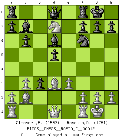 Last move : 0-1 2015 January 5 14:28:48 [Event "FICGS__CHESS__RAPID_C__000121"] [Site "FICGS"] [Date "2014.11.03"] [Round "1"] [White "Simonnet,Franck"] [Black "Ropokis,Dimitrios"] [Result "0-1"] [WhiteElo "1592"] [BlackElo "1761"] 1.d4 b6 2.Nf3 Bb7 3.c4 Nf6 4.e3 e6 5.Nc3 d5 6.Bd3 c5 7.cxd5 exd5 8.O-O Nbd7 9.b3 Bd6 10.Bb2 O-O 11.Ne5 cxd4 12.Nxd7 dxc3 0-1 Queen's pawn : English defense Kingside Castling by player White (move 8) Kingside Castling by player Black (move 10) Player Black won this chess game. Follow this game move after move (download)There must have been a time when men were demigods, or they could not have invented Chess. (Gustav Schenk) Kann Schach nicht schließlich das Nationalspiel der Deutschen werden? Und welche weiteren Ausblicke bieten sich dann dar! Welche Hebung des allgemeinen Kultur-Niveaus, ja der Moral, wenn das Schachbrett den Kartentisch verdrängen würde! Wahrlich, ein Ziel, des Schweißes der Edlen wert! (Siegbert Tarrasch) ¿Que sería del Ajedrez sin errores graciosos?. (Kurt Richter) Vous m'avez demandé de vous exposer quel est le fondement de la prière. Je ne fais que préparer les pièces du jeu sur la table... Nous sera-t-il permis d'en adopter les règles et si nous les appliquons scrupuleusement nous ne tarderons pas à faire mat le Roi divin ! Il ne pourra échapper à nos mains. (Sainte Thérèse d'Avila, Chemin de perfection) He who laughs last probably does not get the joke. (Unknown)