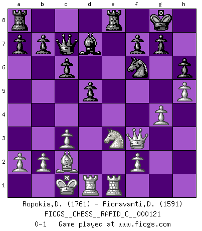 Last move : 0-1 2015 March 3 11:56:19 [Event "FICGS__CHESS__RAPID_C__000121"] [Site "FICGS"] [Date "2014.11.03"] [Round "1"] [White "Ropokis,Dimitrios"] [Black "Fioravanti,Diego"] [Result "0-1"] [WhiteElo "1761"] [BlackElo "1591"] 1.Nc3 e5 2.Nf3 Nc6 3.d4 exd4 4.Nxd4 Nf6 5.Bg5 Bc5 6.e3 O-O 7.Nd5 Bxd4 8.exd4 Qe8+ 9.Ne3 Ne4 10.h4 d6 11.Bd3 Nxd4 12.c3 Ne6 13.Bxe4 Nxg5 14.Bc2 Ne4 15.Qd4 Nf6 16.O-O-O Qe5 17.Qc4 c6 18.Rhe1 d5 19.Qe2 Re8 20.Qf3 Qc7 21.h5 h6 22.g4 Bd7 0-1 This chess game has been lost on time (started : 2014.11.03 3:25:45) Dunst (Sleipner-Heinrichsen) Opening Kingside Castling by player Black (move 6) Queenside Castling by player White (move 16) Player Black won this chess game. Follow this game move after move (download)In complicated positions, Bobby Fischer hardly had to be afraid of anybody. (Paul Keres) Ich trinke, ich rauche, ich spiele, ich liebe Frauen aber Fernschach ist ein Laster, das ich nicht habe. (Mikhail Nekhemyevich Tal) Para mi, el Ajedrez es la vida y cada partida es como una nueva vida. Todo jugador de Ajedrez suele vivir muchas vidas durante su vida. (Eduard Gufeld) Les écrivains ont utilisé les échecs pour analyser les côtés extrêmes de la nature humaine. Dans ce cadre, les échecs offrent un champ d'expérimentation idéal. Mais on pourrait faire la même chose avec la peinture. Et là, en vous référant à Van Gogh, vous ne tirerez pas de conclusion définitive sur les peintres. (Gary Kasparov) Chess is everything: art, science and sport. (Anatoly Karpov)