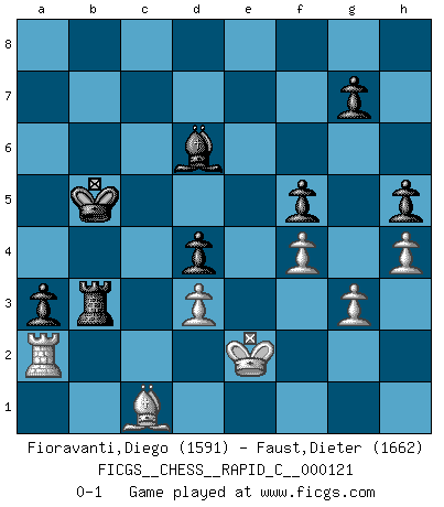Last move : 0-1 2015 February 12 15:37:17 [Event "FICGS__CHESS__RAPID_C__000121"] [Site "FICGS"] [Date "2014.11.03"] [Round "1"] [White "Fioravanti,Diego"] [Black "Faust,Dieter"] [Result "0-1"] [WhiteElo "1591"] [BlackElo "1662"] 1.d4 d5 2.e4 dxe4 3.f3 e5 4.dxe5 Qxd1+ 5.Kxd1 Nc6 6.Bb5 Nge7 7.Nc3 Be6 8.Nxe4 O-O-O 9.Ke1 Nxe5 10.Ne2 c6 11.Ba4 f5 12.N4c3 Nd5 13.Bb3 Bc5 14.Bg5 Rd7 15.Nxd5 Bxd5 16.Bxd5 cxd5 17.Rd1 d4 18.Nc1 Re8 19.Kf1 h6 20.Bf4 Nc4 21.Nd3 Bd6 22.Bc1 Rc7 23.Re1 Ne5 24.f4 Nxd3 25.Rxe8+ Kd7 26.cxd3 Kxe8 27.Kf2 Rc2+ 28.Kf3 h5 29.Re1+ Kd7 30.h4 a5 31.a3 a4 32.Rf1 b5 33.g3 b4 34.Rd1 bxa3 35.bxa3 Ra2 36.Bd2 Rxa3 37.Ke2 Rb3 38.Ra1 a3 39.Bc1 Kc6 40.Ra2 Kb5 0-1 Blackmar gambit Queenside Castling by player Black (move 8) Player Black won this chess game. Follow this game move after move (download)If cunning alone were needed to excel, women would be the best Chess players. (Albin) Ich kämpfe solange mein Gegner einen Fehler machen kann. (Emanuel Lasker) Debió haber existido una vez en que los hombres eran semidióses, de otra manera no hubiesen podido inventar el Ajedrez. (Gustav Schenk) La vie et les Echecs sont tous les deux une lutte constante. (Lasker) The Internet is so big, so powerful and pointless that for some people it is a complete substitute for life. (Andrew Brown)