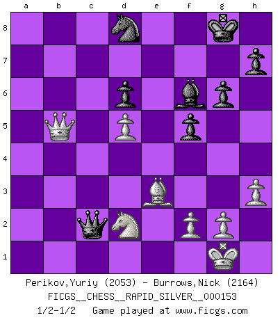 Last move : 1/2-1/2 2014 December 13 20:17:44 [Event "FICGS__CHESS__RAPID_SILVER__000153"] [Site "FICGS"] [Date "2014.11.04"] [Round "1"] [White "Perikov,Yuriy"] [Black "Burrows,Nick"] [Result "1/2-1/2"] [WhiteElo "2053"] [BlackElo "2164"] 1.e4 e5 2.Nf3 Nc6 3.Bb5 a6 4.Ba4 Nf6 5.O-O Be7 6.Re1 b5 7.Bb3 d6 8.a3 O-O 9.d3 Na5 10.Ba2 c5 11.Nc3 Be6 12.Nd5 Nxd5 13.Bxd5 Bxd5 14.exd5 f5 15.b3 Bf6 16.Rb1 c4 17.bxc4 bxc4 18.Be3 Rb8 19.Rb4 cxd3 20.cxd3 Rb5 21.Rxb5 axb5 22.Qb1 Qd7 23.Rc1 Ra8 24.Qb4 Nb7 25.Rc6 Ra4 26.Qc3 e4 27.Rc8+ Nd8 28.Qc6 Qe7 29.Qxb5 Rxa3 30.dxe4 Ra1+ 31.Rc1 Rxc1+ 32.Bxc1 Qxe4 33.Be3 g6 34.Nd2 Qc2 35.h3 1/2-1/2 Ruy Lopez : Closed Kingside Castling by player White (move 5) Kingside Castling by player Black (move 8) This chess game ended in a draw. Follow this game move after move (download)Examine moves that smite! A good eye for smites is far more important than a knowledge of strategical principles. (Purdy) Schach ist ein Teil der Kultur, und wenn es mit der Kultur abwärts geht, geht es auch mit dem Schach abwärts. (Mikhail Moiseyevich Botvinik) Dejen al perfeccionista jugar por correo. (Yasser Seirawan) Les échecs, c'est l'imagination. (David Bronstein) Optimism is a variety of information deficit. Sometimes especially true for correspondence chess games. (Michael Aigner)