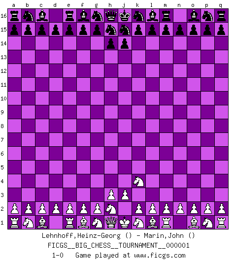 Last move : 1-0 2007 March 4 18:56:12 [Event "FICGS__BIG_CHESS__TOURNAMENT__000001"] [Site "FICGS"] [Date "2007.02.26"] [Round "1"] [White "Lehnhoff,Heinz-Georg"] [Black "Marin,John"] [Result "1-0"] [WhiteElo ""] [BlackElo ""] 1.j2-k4 1-0 Follow this game move after move (download)When you see a good move, look for a better one. (Emanuel Lasker) Mutter, ich bin eben Ex-Weltmeister geworden. --beim nach Hause Kommen nach dem Verlust des WM-Titels an Mihail Botvinnik -- (Mikhail Nekhemyevich Tal) Es el objetivo de la escuela moderna no tratar cada posición de acuerdo a una regla general, sino de acuerdo al principio inherente en la posición. (Richard Reti) Les réformistes prétendent que les progrès de la théorie conduiront à la disparition des échecs, et qu'il faut, pour leur rendre vie, en remanier les règles. En réalité, qu'exprime cette affirmation? Le mépris de l'intuition, de l'imagination et de tous les autres éléments qui font des échecs un art. (Alexander Alekhine) Patience, use the Force, think ! (Obi-Wan Kenobi in Star Wars ep.2)
