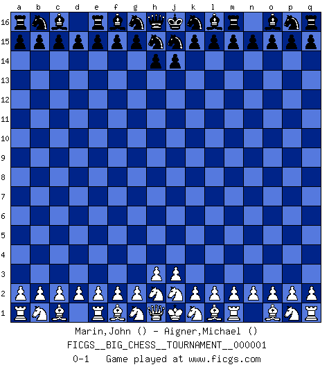 Last move : 0-1 2007 March 4 18:56:30 [Event "FICGS__BIG_CHESS__TOURNAMENT__000001"] [Site "FICGS"] [Date "2007.02.26"] [Round "1"] [White "Marin,John"] [Black "Aigner,Michael"] [Result "0-1"] [WhiteElo ""] [BlackElo ""] 0-1 Follow this game move after move (download)Any material change in a position must come about by mate, a capture, or a Pawn promotion. (Purdy) Ich würde die 30 stärksten Spieler der USA im Simultanspiel besiegen. (José Raúl Capablanca) En posiciones complicadas, Bobby Fischer pocas veces tuvo que temer de cualquiera. (Paul Keres) Le temps de noter son nom sur la feuille de partie, j'étais déjà en zeitnot ! D'un modeste amateur apparié lors de la première ronde d'un open contre le grand-maître Azmaïparashvili. Computers have lots of memory but no imagination. (Anonymous)