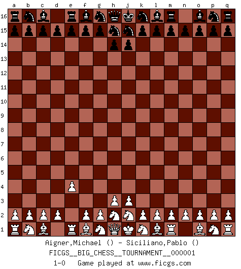 Last move : 1-0 2007 March 11 22:56:54 [Event "FICGS__BIG_CHESS__TOURNAMENT__000001"] [Site "FICGS"] [Date "2007.02.26"] [Round "1"] [White "Aigner,Michael"] [Black "Siciliano,Pablo"] [Result "1-0"] [WhiteElo ""] [BlackElo ""] 1.e2-e4 1-0 Follow this game move after move (download)A bad plan is better than none at all. (Frank Marshall) Schach ist wie eine schöne Frau, zu der wir ständig zurückkehren, gleichviel, wie oft sie uns zurückweist. (Anonymous) La partida mas dura de ganar es una partida ganada. (Emanuel Lasker) Les Echecs sont et restent toujours un combat, un combat intégral comme la boxe, la lutte ou un autre sport, et où il doit y avoir un vainqueur et un vaincu. (Joseph Emil Diemer) A clear conscience is usually the sign of a bad memory. (Unknown)