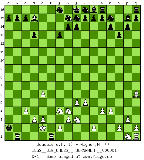Last move : 0-1 2007 March 14 18:44:12 [Event "FICGS__BIG_CHESS__TOURNAMENT__000001"] [Site "FICGS"] [Date "2007.02.26"] [Round "1"] [White "Souquiere,Florence"] [Black "Aigner,Michael"] [Result "0-1"] [WhiteElo ""] [BlackElo ""] 1.e2-e4 p15-p14 2.f1-c4 n15-n14 3.n2-n4 o16-p15 4.m2-m4 p16-n15 5.j3-j4 d15-d13 6.o1-d11 e15-e13 7.k2-k4 e13-e12 8.c4-g8 e12-d11 9.g8-d11 e16-e11 10.d2-d3 e11-d11 11.c1-k8 f16-d14 12.l1-q6 d14-k8 13.p2-p3 p15-b2 14.b1-d2 k8-d2 15.j2-h4 c16-k9 16.e1-e3 d2-e3 17.h2-g4 b2-a1 18.f2-e3 a1-p15 19.h1-o7 o15-o13 20.o7-f15 b16-d15 21.j4-j5 a16-f16 22.f15-d15 k9-d15 23.e4-e5 f16-f1 24.k1-j3 f1-g1 25.j1-h2 g1-m1 26.k4-k5 d11-b11 27.h2-g3 g15-g13 28.c2-c4 b11-b1 29.e5-e6 h16-a9 30.g3-f2 m1-f1 31.f2-e2 a9-a2 0-1 Follow this game move after move (download)There are tough players and nice guys, and I'm a tough player. (Bobby Fischer) Der beste Spieler in einem Turnier gewinnt es nie. Er landet auf Platz zwei oder drei. (Siegbert Tarrasch) El Ajedrez es parte de una cultura y si una cultura esta en decadencia, entonces también el Ajedrez declinará. (Mikhail Botvinnik) J'ai toujours senti une vague pitié pour l'homme qui ne connaît rien aux échecs, tout comme j'en aurais pour un homme ignorant de l'amour. Les Echecs, comme la musique ou comme l'amour, ont le pouvoir de rendre heureux. (Siegbert Tarrasch) Chess is everything: art, science and sport. (Anatoly Karpov)