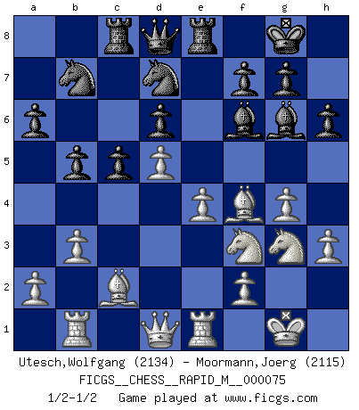 Last move : 1/2-1/2 2015 January 6 22:17:37 [Event "FICGS__CHESS__RAPID_M__000075"] [Site "FICGS"] [Date "2014.11.07"] [Round "1"] [White "Utesch,Wolfgang"] [Black "Moormann,Joerg"] [Result "1/2-1/2"] [WhiteElo "2134"] [BlackElo "2115"] 1.e4 e5 2.Nf3 Nc6 3.Bb5 a6 4.Ba4 Nf6 5.O-O Be7 6.Re1 b5 7.Bb3 d6 8.c3 O-O 9.d4 Bg4 10.Be3 exd4 11.cxd4 Na5 12.Bc2 c5 13.h3 Bh5 14.g4 Bg6 15.Nbd2 Nd7 16.d5 Bf6 17.Rb1 Re8 18.Bf4 Nb7 19.Nf1 h6 20.b3 Rc8 21.Ng3 Bc3 22.Bd2 Bf6 23.Bf4 1/2-1/2 Ruy Lopez : Closed Kingside Castling by player White (move 5) Kingside Castling by player Black (move 8) This chess game ended in a draw. Follow this game move after move (download)You may learn much more from a game you lose than from a game you win. You will have to lose hundreds of games before becoming a good player. (Jose Raul Capablanca) In der Schule lernt man nichts. Es ist nur Zeitverschwendung. (Robert James Fischer) Existen dos clases de sacrificios: los correctos y los míos. (Mikhail Tal) Vous savez, camarade Pachman, je n'éprouve pas de plaisir à être ministre, je jouerais plutôt aux échecs comme vous, ou alors ferais une révolution au Venezuela. (Che Guevara à Ludek Pachman, 'Checkmate in Prague', 1975) A journey of a thousand sites begins with a single click. (Author unknown)