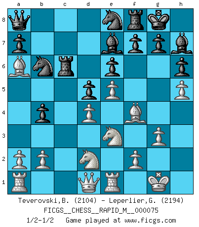 Last move : 1/2-1/2 2014 December 15 23:40:43 [Event "FICGS__CHESS__RAPID_M__000075"] [Site "FICGS"] [Date "2014.11.07"] [Round "1"] [White "Teverovski,Bogoljub"] [Black "Leperlier,Gabriel"] [Result "1/2-1/2"] [WhiteElo "2104"] [BlackElo "2194"] 1.d4 Nf6 2.c4 e6 3.g3 d5 4.Bg2 Be7 5.Nf3 O-O 6.O-O Nbd7 7.Qc2 c6 8.Nbd2 b6 9.e4 Bb7 10.e5 Ne8 11.cxd5 cxd5 12.Re1 Rc8 13.Qa4 Nc7 14.Nf1 b5 15.Qd1 b4 16.h4 h6 17.N1h2 Ne8 18.Ng4 Ba6 19.Bf4 Nb6 20.Nd2 Bd3 21.Bf1 Bf5 22.Ba6 Rc6 23.Ne3 Bh7 24.h5 Qa8 25.Bb5 Rc8 26.Ba6 Rc6 27.Bb5 Rc8 28.Ba6 Rc6 1/2-1/2 Catalan : Closed, 7.Qc2 Kingside Castling by player Black (move 5) Kingside Castling by player White (move 6) This chess game ended in a draw. Follow this game move after move (download)Look at Garry Kasparov. After he loses, invariably he wins the next game. He just kills the next guy. That's something that we have to learn to be able to do. (Maurice Ashley) Ich könnte leicht behaupten: Ja,ja, Leonid Breschnew wollte nicht, daß ich Weltmeister werde. In der Tat war die Sache komplizierter. (Viktor Kortschnoi) El arma más poderosa en el Ajedrez, es tener la próxima movida. (David Bronstein) Il n'y a plus de joueurs du niveau de Jacob Murray dont la seule quête est le beau jeu, le plaisir de voir les pièces construire quelque chose. Sur 10 idées à la minute, 9 seront sans intérêt, la dernière s'avèrera géniale. (Christian Bauer) He who defends everything defends nothing. (Frederick the Great)