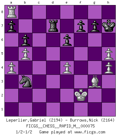 Last move : 1/2-1/2 2015 February 19 22:44:40 [Event "FICGS__CHESS__RAPID_M__000075"] [Site "FICGS"] [Date "2014.11.07"] [Round "1"] [White "Leperlier,Gabriel"] [Black "Burrows,Nick"] [Result "1/2-1/2"] [WhiteElo "2194"] [BlackElo "2164"] 1.d4 Nf6 2.c4 e6 3.Nf3 d5 4.Nc3 Be7 5.Bf4 O-O 6.e3 Nbd7 7.Bd3 c5 8.O-O cxd4 9.exd4 dxc4 10.Bxc4 Nb6 11.Bb3 Nbd5 12.Bd2 b6 13.Nxd5 Nxd5 14.Rc1 Bb7 15.Qe2 Nf6 16.Rfd1 Bd5 17.Bxd5 Qxd5 18.Qa6 h6 19.Bf4 Qf5 20.Bg3 Nd5 21.a3 Rfd8 22.h3 Bg5 23.Nxg5 Qxg5 24.Be5 Rd7 25.Qe2 Rad8 26.b4 Nf4 27.Qf3 Ng6 28.Bc7 Re8 29.Bg3 Qb5 30.Qe4 Ne7 31.Kh2 Qf5 32.Qe2 Qd5 33.f3 Nf5 34.Bf2 Red8 35.g4 Qd6+ 36.Kg2 Ne7 37.Bg3 Qd5 38.b5 Qb3 39.Qc4 Qe3 40.Qd3 Qg5 41.h4 Qd5 42.Kf2 h5 43.Qc4 Qa8 44.gxh5 Rc8 45.Qd3 Rxc1 46.Rxc1 Qd8 47.Rc4 Nf5 48.a4 Nxd4 49.Qc3 Kh7 50.Rc8 Qe7 51.Ra8 Qf6 52.Qd3+ Qf5 53.Qe4 Qxe4 54.fxe4 Nb3 1/2-1/2 Queen's pawn game Kingside Castling by player Black (move 5) Kingside Castling by player White (move 8) This chess game ended in a draw. Follow this game move after move (download)When the Chess game is over, the Pawn and the King go back to the same box. (Irish saying) Sie bekommen vielleicht den Eindruck, dass die Spitzenspieler überhaupt gar nicht so stark sind. Aber das stimmt nicht. Es ist eine Illusion. Mit einem Computer an der Seite ist es sehr leicht, Urteile zu fällen, aber wenn man alleine am Brett sitzt, sieht die Sache ganz anders aus. (Vladimir Kramnik) Jugadores de primera clase pierden en contra de jugadores de segunda clase porque los jugadores de segunda clase a veces juegan una partida de primer clase. (Siegbert Tarrasch) Les Echecs mettent en conflit, non pas deux intelligences, mais deux volontés. (Lasker) Optimism is a variety of information deficit. Sometimes especially true for correspondence chess games. (Michael Aigner)