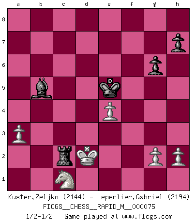 Last move : 1/2-1/2 2015 January 14 11:14:2 [Event "FICGS__CHESS__RAPID_M__000075"] [Site "FICGS"] [Date "2014.11.07"] [Round "1"] [White "Kuster,Zeljko"] [Black "Leperlier,Gabriel"] [Result "1/2-1/2"] [WhiteElo "2144"] [BlackElo "2194"] 1.b3 e5 2.Bb2 Nc6 3.e3 Nf6 4.Bb5 d6 5.Ne2 a6 6.Bxc6+ bxc6 7.c4 Be7 8.d4 exd4 9.Nxd4 Bd7 10.Qc2 O-O 11.O-O Re8 12.Nc3 a5 13.Rad1 c5 14.Nf5 Bf8 15.Ng3 g6 16.e4 Bg7 17.f3 a4 18.bxa4 Qb8 19.a3 Qa7 20.Nb5 Qxa4 21.Qxa4 Rxa4 22.Nxc7 Rc8 23.Rxd6 Rxc7 24.Bxf6 Bxf6 25.Rxf6 Rxc4 26.Rd6 Rc2 27.Rfd1 Ba4 28.R1d2 Rxd2 29.Rxd2 c4 30.Ne2 c3 31.Rd8+ Kg7 32.Kf2 c2 33.Nc1 Bd7 34.Ke2 f5 35.Kd2 fxe4 36.fxe4 Kf6 37.Rb8 Rc4 38.Kd3 Rc5 39.Rb2 Ke5 40.Rxc2 Bb5+ 41.Kd2 Rxc2+ 1/2-1/2 Nimzovich-Larsen attack : Modern variation Kingside Castling by player Black (move 10) Kingside Castling by player White (move 11) This chess game ended in a draw. Follow this game move after move (download)Life is like a game of Chess, changing with each move. (Chinese proverb) Wenn ich Weiß habe gewinne ich weil ich Weiß habe, wenn ich Schwarz habe gewinne ich weil ich Bogoljubov bin. (Efim Bogoljubov) Yo no le temo a Spassky. Todos saben que yo soy el mejor. Uno no necesita un torneo para probarlo. (Bobby Fischer) Les échecs sont un jeu terrible. Si vous n'avez pas le centre, votre adversaire a une position plus libre. Par contre, si vous avez le centre, alors vous avez vraiment quelque chose pour laquelle vous inquiéter ! (Siegbert Tarrasch) If only people were all showed a certain minimum level of niceness; if only people didn't retract verbal draw offers (without draw box ticked) on ficgs; if only people didn't kill; if only people didn't run concentration / extermination camps, if only people didn't drop nuclear bombs on Hiroshima and Nagasaki, and so on - it would be a much more beautiful world. But sadly, things are not so... (Normajean Yates)