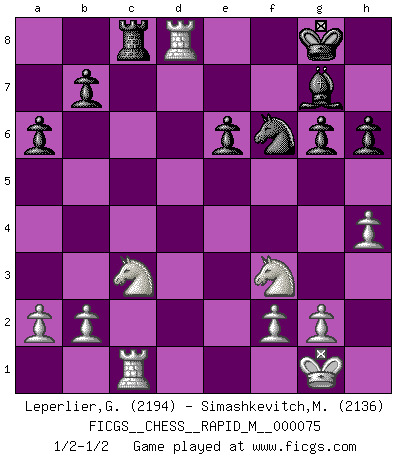 Last move : 1/2-1/2 2015 January 11 9:49:17 [Event "FICGS__CHESS__RAPID_M__000075"] [Site "FICGS"] [Date "2014.11.07"] [Round "1"] [White "Leperlier,Gabriel"] [Black "Simashkevitch,Mykola"] [Result "1/2-1/2"] [WhiteElo "2194"] [BlackElo "2136"] 1.d4 d5 2.c4 c6 3.Nf3 Nf6 4.Nc3 e6 5.Bg5 h6 6.Bxf6 Qxf6 7.e3 Nd7 8.Bd3 dxc4 9.Bxc4 g6 10.h4 Bg7 11.Rc1 O-O 12.O-O Qe7 13.Qc2 Rd8 14.Bd3 c5 15.Rfd1 cxd4 16.exd4 Nf6 17.Qe2 Bd7 18.d5 Rac8 19.Bc4 a6 20.Bb3 Qe8 21.dxe6 Bxe6 22.Bxe6 Qxe6 23.Qxe6 fxe6 24.Rxd8+ 1/2-1/2 QGD Slav : 4.Nc3 Kingside Castling by player Black (move 11) Kingside Castling by player White (move 12) This chess game ended in a draw. Follow this game move after move (download)Look at Garry Kasparov. After he loses, invariably he wins the next game. He just kills the next guy. That's something that we have to learn to be able to do. (Maurice Ashley) Eine Person mit durchschnittlichem IQ kann etwa eine ELO von 2000 erreichen. (Jonathan Levitt) No es suficiente ser un buen jugador, se debe también de jugar bién. (Siegbert Tarrasch) Les écrivains ont utilisé les échecs pour analyser les côtés extrêmes de la nature humaine. Dans ce cadre, les échecs offrent un champ d'expérimentation idéal. Mais on pourrait faire la même chose avec la peinture. Et là, en vous référant à Van Gogh, vous ne tirerez pas de conclusion définitive sur les peintres. (Gary Kasparov) The smarter you play, the luckier you'll be. (Mark Pilarski)