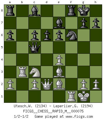 Last move : 1/2-1/2 2014 November 9 23:20:21 [Event "FICGS__CHESS__RAPID_M__000075"] [Site "FICGS"] [Date "2014.11.07"] [Round "1"] [White "Utesch,Wolfgang"] [Black "Leperlier,Gabriel"] [Result "1/2-1/2"] [WhiteElo "2134"] [BlackElo "2194"] 1.e4 c5 2.Nf3 d6 3.d4 cxd4 4.Nxd4 Nf6 5.Nc3 a6 6.Bg5 e6 7.f4 Qb6 8.Qd2 Qxb2 9.Rb1 Qa3 10.f5 Nc6 11.fxe6 fxe6 12.Nxc6 bxc6 13.Be2 Be7 14.O-O O-O 15.Rb3 Qc5+ 16.Be3 1/2-1/2 Sicilian : Najdorf, 7...Qb6 Kingside Castling by player White (move 14) Kingside Castling by player Black (move 14) This chess game ended in a draw. Follow this game move after move (download)Fischer is under obligation to nobody. (Joseph Platz) Strategie ist, wie man ein Mädchen auf den Rücksitz bekommt. Taktik ist, was man tut, wenn man dann dort ist. (Anonymous) Un buen jugador siempre tiene buena suerte. (José Raúl Capablanca) Les ravages du H expliquent la différence de niveau entre Tal et Thal [Abergel]. I take risks, sometimes patients die, but not taking risks causes more patients to die. So I guess my biggest problem is I've been cursed with the ability to do the math. (Gregory House, House M.D.)