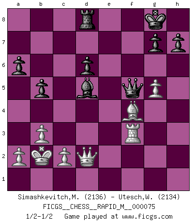 Last move : 1/2-1/2 2014 November 22 18:1:37 [Event "FICGS__CHESS__RAPID_M__000075"] [Site "FICGS"] [Date "2014.11.07"] [Round "1"] [White "Simashkevitch,Mykola"] [Black "Utesch,Wolfgang"] [Result "1/2-1/2"] [WhiteElo "2136"] [BlackElo "2134"] 1.e4 c5 2.Nf3 d6 3.d4 cxd4 4.Nxd4 Nf6 5.Nc3 a6 6.Be3 e5 7.Nb3 Be6 8.f3 Be7 9.Qd2 O-O 10.O-O-O Nbd7 11.g4 b5 12.g5 Nh5 13.Kb1 Nb6 14.Nd5 Nxd5 15.exd5 Bf5 16.Na5 f6 17.Nc6 Qd7 18.h4 Ng3 19.Rg1 Nxf1 20.Rdxf1 fxg5 21.hxg5 Bg6 22.Rf2 Rf5 23.b3 Re8 24.Qa5 Qc8 25.Qd2 Bd8 26.Rgf1 Bf7 27.Kb2 Qd7 28.f4 exf4 29.Rxf4 Rxf4 30.Bxf4 Qf5 31.Nxd8 Rxd8 32.Rf3 Bxd5 1/2-1/2 Sicilian : Najdorf, Byrne (English) attack Kingside Castling by player Black (move 9) Queenside Castling by player White (move 10) This chess game ended in a draw. Follow this game move after move (download)Any material change in a position must come about by mate, a capture, or a Pawn promotion. (Purdy) Es hat in meinem Leben Zeiten gegeben, da ich sehr nahe daran war zu glauben, daß ich auch nicht eine einzige Schachpartie verlieren könnte. (José Raúl Capablanca) Los libros de Ajedrez deben de usarse igual como usamos los anteojos: para mejorar la vista, aunque algunos jugadores los quieren usar como si ellos les otorgaran la vision. (José Raúl Capablanca) Ce qui est bien, c'est d'avoir tout un tas de pièces en prise : l'adversaire ne peut en prendre qu'une à la fois. Cité par Thierry Audin. Hardware: the parts of a computer that can be kicked. (Jeff Persis)