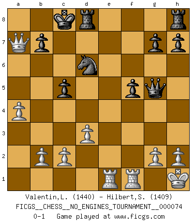 Last move : 0-1 2015 February 16 19:39:13 [Event "FICGS__CHESS__NO_ENGINES_TOURNAMENT__000074"] [Site "FICGS"] [Date "2014.11.08"] [Round "1"] [White "Valentin,Laurentiu"] [Black "Hilbert,Stephan J."] [Result "0-1"] [WhiteElo "1440"] [BlackElo "1409"] 1.e4 c5 2.f4 e5 3.Nf3 d5 4.Nxe5 Nc6 5.exd5 Nxe5 6.fxe5 Qxd5 7.Nc3 Qxe5+ 8.Be2 Bg4 9.O-O Bxe2 10.Nxe2 Nf6 11.d3 O-O-O 12.Bf4 Qh5 13.Qd2 Ne4 14.Qa5 Qxe2 15.Qxa7 Bd6 16.Bxd6 Qe3+ 17.Kh1 Nxd6 18.Rae1 Qg5 19.a4 f5 0-1 This chess game has been lost on time (started : 2014.11.08 10:29:34) Sicilian : Grand Prix attack Kingside Castling by player White (move 9) Queenside Castling by player Black (move 11) Player Black won this chess game. Follow this game move after move (download)Place the contents of the Chess box in a hat, shake them up vigorously, pour them on the board from a height of two feet, and you get the style of Steinitz. (H. E. Bird) Wer der Ansicht ist, daß alle Schachspieler verrückt sind, wird durch Studium des Lebens von Emil Josef Diemer nicht auf andere Gedanken kommen. (Hans Ree) El Ajedrez es parte de una cultura y si una cultura esta en decadencia, entonces también el Ajedrez declinará. (Mikhail Botvinnik) Les échecs, c'est la lutte contre l'erreur. (Johannes Zukertort) Cactus - It is depressed cucumber. (Ilmars Cirulis)