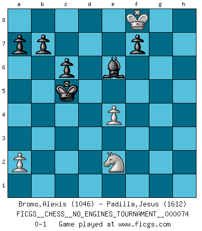 Last move : 0-1 2015 June 18 20:51:12 [Event "FICGS__CHESS__NO_ENGINES_TOURNAMENT__000074"] [Site "FICGS"] [Date "2014.11.08"] [Round "1"] [White "Bromo,Alexis"] [Black "Padilla,Jesus"] [Result "0-1"] [WhiteElo "1046"] [BlackElo "1612"] 1.d4 Nf6 2.c4 g6 3.Nc3 Bg7 4.Nf3 O-O 5.e3 d6 6.h3 Nbd7 7.b3 e5 8.Bb2 Re8 9.dxe5 dxe5 10.e4 c6 11.Be2 Nc5 12.Qxd8 Rxd8 13.Rd1 Rxd1+ 14.Bxd1 Nd3+ 15.Kd2 Nxb2 16.Kc2 Nxc4 17.bxc4 Be6 18.Be2 Rd8 19.Ng5 Bc8 20.c5 h6 21.Nf3 Be6 22.Rd1 Rxd1 23.Kxd1 Kf8 24.Nxe5 Nh5 25.Bxh5 gxh5 26.f4 Bxe5 27.fxe5 Ke7 28.Ke2 Bc4+ 29.Ke3 Bf1 30.Kf4 Bxg2 31.Kg3 Bf1 32.Kh4 Ke6 33.Kxh5 Kxe5 34.Kxh6 Bxh3 35.Kg7 Be6 36.Kf8 Kd4 37.Ne2+ Kxc5 0-1 King's Indian defense, 3.Nc3 Kingside Castling by player Black (move 4) 10 pieces endgame at move 37 : White KNPP , Black KBPPPP WHITE : King + 1 Knight 2 Pawns BLACK : King + 1 Bishop 4 Pawns Player Black won this chess game. Follow this game move after move (download)Bobby is the finest Chess player this country ever produced. His memory for the moves, his brilliance in dreaming up combinations, and his fierce determination to win are uncanny. (John Collins) Schon mancher Spieler hat aufgegeben, um zu vermeiden, daß er eine Figur verliert. (Savielly Grigorievitsch Tartakower) El jugador táctico sabe que hacer cuando hay algo que hacer; mientras que el estratega sabe que hacer cuando no hay nada que hacer. (Gerald Abrahams) Les erreurs sont comme les malheurs, elles n'arrivent jamais seules. (Siegbert Tarrasch) Political correctness is subjecting us to gross incompetence. (Johann Piek)