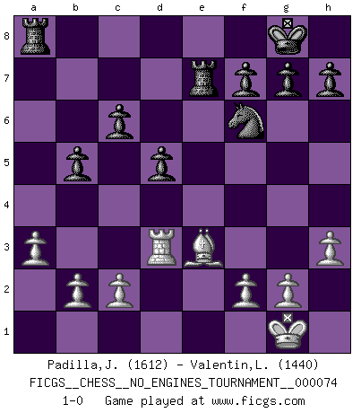 Last move : 1-0 2015 May 21 9:0:34 [Event "FICGS__CHESS__NO_ENGINES_TOURNAMENT__000074"] [Site "FICGS"] [Date "2014.11.08"] [Round "1"] [White "Padilla,Jesus"] [Black "Valentin,Laurentiu"] [Result "1-0"] [WhiteElo "1612"] [BlackElo "1440"] 1.e4 d5 2.exd5 Qxd5 3.Nc3 Qd8 4.Nf3 e6 5.d4 Nf6 6.Ne5 Be7 7.Bd3 O-O 8.O-O a6 9.Be3 b5 10.Qf3 Ra7 11.d5 Rb7 12.Rad1 exd5 13.Ne2 Nbd7 14.Nc6 Qe8 15.Ng3 Nc5 16.Nb4 Bg4 17.Qf4 a5 18.h3 Bxd1 19.Rxd1 axb4 20.Nf5 c6 21.Nxe7+ Qxe7 22.Qxb4 Nxd3 23.Qxe7 Rxe7 24.Rxd3 Ra8 25.a3 1-0 This chess game has been lost on time (started : 2014.11.08 10:29:34) Scandinavian (centre counter) defense Kingside Castling by player Black (move 7) Kingside Castling by player White (move 8) Player White won this chess game. Follow this game move after move (download)The combination player thinks forward; he starts from the given position, and tries the forceful moves in his mind. (Emanuel Lasker) Wenn du gegen Bobby spielst, ist es keine Frage von gewinnen oder verlieren. Es ist eine Frage des Überlebens. (Boris Vassilievich Spassky) Morphy probablemente fue el genio más grande de todos. (Bobby Fischer) Pour se monter efficace, un Cavalier a besoin d'avant-postes ! Les Cavaliers font les meilleurs bloqueurs de pions passés. True nature is revealed in times of difficulty. (Chinese proverb)