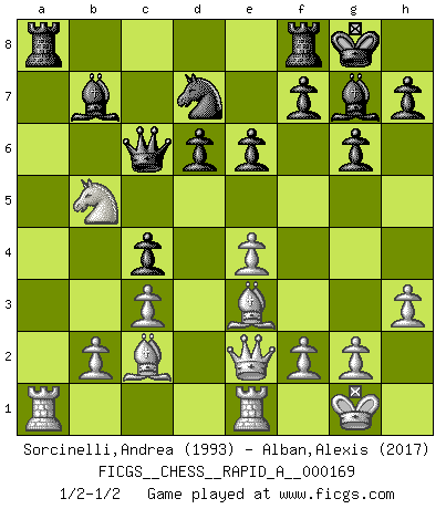 Last move : 1/2-1/2 2015 January 27 6:47:23 [Event "FICGS__CHESS__RAPID_A__000169"] [Site "FICGS"] [Date "2014.11.09"] [Round "1"] [White "Sorcinelli,Andrea"] [Black "Alban,Alexis"] [Result "1/2-1/2"] [WhiteElo "1993"] [BlackElo "2017"] 1.e4 c5 2.Nf3 d6 3.Bc4 Nf6 4.d3 Nc6 5.c3 g6 6.O-O Bg7 7.Bb3 O-O 8.Re1 a6 9.h3 b5 10.Be3 Qc7 11.Nbd2 Bb7 12.d4 Nd7 13.a4 e6 14.Qe2 Na5 15.Bc2 Nc4 16.axb5 axb5 17.Nxc4 cxd4 18.Nxd4 bxc4 19.Nb5 Qc6 20.Na7 Qc7 21.Nb5 Qc6 1/2-1/2 Sicilian Kingside Castling by player White (move 6) Kingside Castling by player Black (move 7) This chess game ended in a draw. Follow this game move after move (download)If I win a tournament, I win it by myself. I do the playing. Nobody helps me. (Bobby Fischer) Modernes Schach erfordert enorme Anspannung. Es ist für einen normalen Menschen unmöglich das auszuhalten. (Viktor Kortschnoi) No volvere nunca a jugar contigo. Has insultado a mi amigo. - cuando un oponente se maldijo por una mala jugada (Miguel Najdorf) Toute estimation doit être constamment réévaluée. (Jacob Estrin) Warrior pose battles inner weakness and wins focus. You see that there is no war within you. You're on your own side, and you are your own strength. (Terri Guillemets)