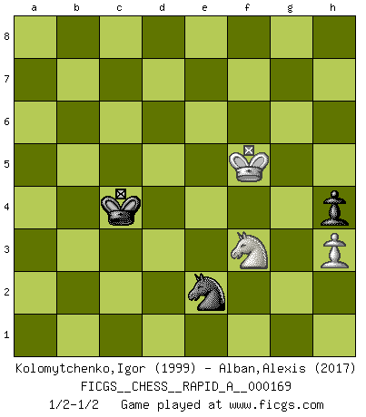 Last move : 1/2-1/2 2015 February 22 16:39:14 [Event "FICGS__CHESS__RAPID_A__000169"] [Site "FICGS"] [Date "2014.11.09"] [Round "1"] [White "Kolomytchenko,Igor"] [Black "Alban,Alexis"] [Result "1/2-1/2"] [WhiteElo "1999"] [BlackElo "2017"] 1.e4 c5 2.Nf3 d6 3.d4 cxd4 4.Nxd4 Nf6 5.Nc3 Nc6 6.Bg5 e6 7.Qd2 Be7 8.O-O-O O-O 9.f4 h6 10.Bh4 Nxd4 11.Qxd4 Qa5 12.e5 dxe5 13.Qxe5 Qxe5 14.fxe5 Nd5 15.Bxe7 Nxe7 16.Bd3 b6 17.Be4 Rb8 18.Rhe1 Bb7 19.Rd7 Bxe4 20.Rxe4 Nc6 21.Nb5 Rfd8 22.Rc7 Rdc8 23.Rxc8+ Rxc8 24.Rc4 Ne7 25.Rxc8+ Nxc8 26.Kd2 f6 27.Ke3 Kf8 28.g4 Ke8 29.Ke4 Ke7 30.b4 Kd7 31.c4 a5 32.bxa5 bxa5 33.Nd4 a4 34.Nb5 Ne7 35.exf6 gxf6 36.Nc3 a3 37.Kd4 Nc6+ 38.Kc5 Ne5 39.h3 f5 40.gxf5 exf5 41.Kd4 Nc6+ 42.Kd5 h5 43.Nb1 h4 44.Nxa3 Nb4+ 45.Kd4 Kc6 46.Nb1 Nxa2 47.Nd2 Nc1 48.Nf3 Ne2+ 49.Ke5 Kc5 50.Kxf5 Kxc4 1/2-1/2 Sicilian : Richter-Rauzer, Rauzer attack, 7...Be7 Queenside Castling by player White (move 8) Kingside Castling by player Black (move 8) 10 pieces endgame at move 40 : White KNPPP , Black KNPPP WHITE : King + 1 Knight 3 Pawns BLACK : King + 1 Knight 3 Pawns 9 pieces endgame at move 44 : White KNPPP , Black KNPP WHITE : King + 1 Knight 3 Pawns BLACK : King + 1 Knight 2 Pawns 8 pieces endgame at move 46 : White KNPP , Black KNPP WHITE : King + 1 Knight 2 Pawns BLACK : King + 1 Knight 2 Pawns 7 pieces endgame at move 50 : White KNPP , Black KNP WHITE : King + 1 Knight 2 Pawns BLACK : King + 1 Knight 1 Pawn 6 pieces endgame at move 50 : White KNP , Black KNP WHITE : King + 1 Knight 1 Pawn BLACK : King + 1 Knight 1 Pawn This chess game ended in a draw. Follow this game move after move (download)Fischer was a master of clarity and a king of artful positioning. His opponents would see where he was going but were powerless to stop him. (Bruce Pandolfini) Ein Buch ist ein Spiegel; wenn ein Affe hineinsieht, so kann kein Apostel heraus gucken. (Georg Christoph Lichtenberg) La captura del Rey enemigo es la finalidad pero no el primer objetivo de la partida. (William Steinitz) Toutes choses étant égales, c'est la conviction qui gagne. Alliée à une volonté de vaincre, elle sert de détonateur, suscite des idées, disperse les doutes et aide à penser clairement. (Robert Fischer) Art is the only way to run away without leaving home. (Twyla Tharp)