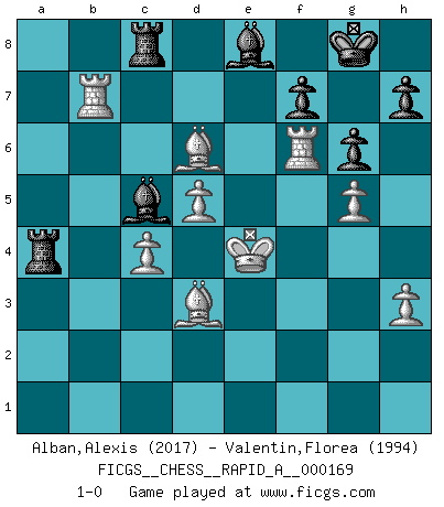 Last move : 1-0 2015 February 26 20:24:43 [Event "FICGS__CHESS__RAPID_A__000169"] [Site "FICGS"] [Date "2014.11.09"] [Round "1"] [White "Alban,Alexis"] [Black "Valentin,Florea"] [Result "1-0"] [WhiteElo "2017"] [BlackElo "1994"] 1.e4 c5 2.Nf3 d6 3.d4 cxd4 4.Nxd4 Nf6 5.Nc3 a6 6.Be3 e5 7.Nb3 Be6 8.Be2 Be7 9.Qd3 O-O 10.O-O Nc6 11.a3 Na5 12.Nd5 Nxb3 13.Qxb3 Nxd5 14.exd5 Bf5 15.c4 Qd7 16.Rfd1 Rfc8 17.Rac1 b6 18.Qb4 Rab8 19.Qd2 a5 20.b4 Qa7 21.h3 Bf8 22.g4 Bd7 23.bxa5 Qxa5 24.Rb1 Ra8 25.Rxb6 Qxa3 26.Rdb1 Qa2 27.R6b2 Qa4 28.Bd3 Be8 29.Kg2 g6 30.Rb7 Qa2 31.Qxa2 Rxa2 32.R1b6 Kg7 33.Bc1 R2a8 34.f3 Kg8 35.Kf2 Ra2+ 36.Bb2 R2a8 37.g5 Kg7 38.f4 Kg8 39.fxe5 dxe5 40.Kf3 Bg7 41.Ke4 Bf8 42.Bxe5 Bc5 43.Rf6 Ra4 44.Bd6 1-0 This chess game has been lost on time (started : 2014.11.09 12:3:48) Sicilian : Najdorf, Byrne (English) attack Kingside Castling by player Black (move 9) Kingside Castling by player White (move 10) Player White won this chess game. Follow this game move after move (download)It's always better to sacrifice your opponent's men. (Savielly Tartakover) Später, ... hatte ich zunehmend Erfolg in entscheidenden Partien. Vielleicht weil ich eine einfache Wahrheit erkannte: nicht nur ich hatte Angst, auch mein Gegner. (Mikhail Nekhemyevich Tal) En el Ajedrez, tal como en la vida, las bendiciones de hoy pueden ser el veneno del mañana. (Assaic) Mais l'homme est une créature légère et illogique : semblable au joueur d'échecs, il n'aime que le processus du but à atteindre, non le but lui-même. (Dostoïevsky) Hold em is to stud what chess is to checkers. (Johnny Moss)