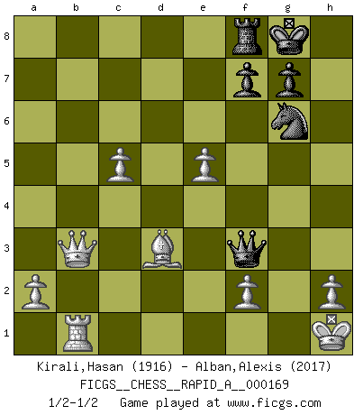Last move : 1/2-1/2 2015 February 16 22:51:25 [Event "FICGS__CHESS__RAPID_A__000169"] [Site "FICGS"] [Date "2014.11.09"] [Round "1"] [White "Kirali,Hasan"] [Black "Alban,Alexis"] [Result "1/2-1/2"] [WhiteElo "1916"] [BlackElo "2017"] 1.e4 e5 2.Nf3 Nc6 3.Bb5 a6 4.Ba4 Nf6 5.O-O Be7 6.Re1 d6 7.c3 b5 8.Bb3 O-O 9.d4 Bg4 10.Be3 exd4 11.cxd4 d5 12.e5 Ne4 13.Nc3 Nxc3 14.bxc3 Bh5 15.Bc2 Rb8 16.Bd3 h6 17.Qc1 Qd7 18.Bxh6 Qe6 19.Bg5 Bxf3 20.gxf3 b4 21.Bxe7 Nxe7 22.Rb1 bxc3 23.Qxc3 Ng6 24.Kh1 Rxb1 25.Rxb1 Qh3 26.Bxa6 c5 27.dxc5 d4 28.Qb3 d3 29.Bxd3 Qxf3+ 30.Kg1 Qg4+ 31.Kh1 Qf3+ 1/2-1/2 Ruy Lopez : Closed, Averbach variation Kingside Castling by player White (move 5) Kingside Castling by player Black (move 8) This chess game ended in a draw. Follow this game move after move (download)Could we look into the head of a Chess player, we should see there a whole world of feelings, images, ideas, emotion and passion. (Alfred Binet) Der zweitbeste Zug ist oft der einzig richtige. (Savielly Grigorievitsch Tartakower) Yo no creo en la psicología. Yo creo en las buenas movidas. (Bobby Fischer) La victoire dans une partie d'Echecs appartient la plupart du temps à celui qui voit un peu plus loin que l'adversaire. (Lasker) Patience, use the Force, think ! (Obi-Wan Kenobi in Star Wars ep.2)