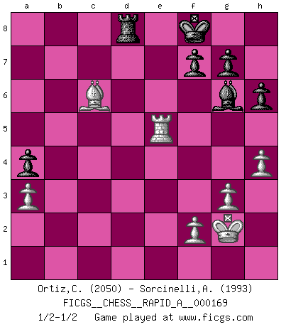 Last move : 1/2-1/2 2014 November 19 3:23:34 [Event "FICGS__CHESS__RAPID_A__000169"] [Site "FICGS"] [Date "2014.11.09"] [Round "1"] [White "Ortiz,Clodomiro"] [Black "Sorcinelli,Andrea"] [Result "1/2-1/2"] [WhiteElo "2050"] [BlackElo "1993"] 1.d4 Nf6 2.c4 e6 3.Nc3 Bb4 4.Qc2 O-O 5.Nf3 c5 6.dxc5 Na6 7.g3 Nxc5 8.Bg2 Nce4 9.O-O Nxc3 10.bxc3 Be7 11.e4 d6 12.e5 dxe5 13.Nxe5 Qc7 14.Qe2 Bd6 15.Re1 Nd7 16.Bf4 Bxe5 17.Bxe5 Nxe5 18.Qxe5 Qxc4 19.Red1 a5 20.a3 h6 21.Rab1 Qa4 22.Qc5 e5 23.Re1 Bf5 24.Rxb7 Rac8 25.Qxe5 Rfe8 26.Re7 Rxe7 27.Qxe7 Qb3 28.h4 Qxc3 29.Bd5 Bg6 30.Bb7 Rb8 31.Re3 Qd4 32.Qc7 Qd8 33.Qxd8+ Rxd8 34.Re5 a4 35.Kg2 Kf8 36.Bc6 1/2-1/2 Nimzo-Indian : Classical variation Kingside Castling by player Black (move 4) Kingside Castling by player White (move 9) This chess game ended in a draw. Follow this game move after move (download)Chess is a matter of delicate judgment, knowing when to punch and how to duck. (Bobby Fischer) Das Schach ist nichts für kleine Geister, es beansprucht einen vollen Mann, der sich nicht sklavisch an das Überlieferte hält, sondern selbständig die Tiefen des Spiels zu ergründen sucht. (Wilhelm Steinitz) Me gusta decir que Bobby Fischer fue el mejor jugador que jamás haya existido. Pero lo que hizo de Fischer un genio, fue su habilidad de mezclar una frescura y pragmatismo Americano con ideas Rusas acerca de la estrategia. (Bruce Pandolfini) Le jeu d'échecs fait naître et fortifie en nous plusieurs qualités précieuses dans le cours de l'existence, telles que la prévoyance, la circonspection, la prudence, et la persévérance. (Benjamin Franklin - 1783, la morale des échecs) Ah, beer! The cause of, and the solution to, all of life's problems. (Homer Simpson)