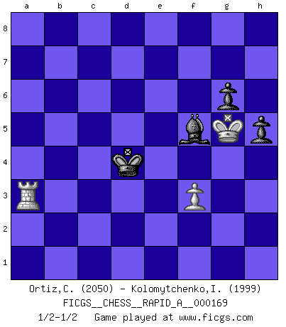 Last move : 1/2-1/2 2015 February 23 8:50:1 [Event "FICGS__CHESS__RAPID_A__000169"] [Site "FICGS"] [Date "2014.11.09"] [Round "1"] [White "Ortiz,Clodomiro"] [Black "Kolomytchenko,Igor"] [Result "1/2-1/2"] [WhiteElo "2050"] [BlackElo "1999"] 1.c4 c6 2.e4 d5 3.exd5 cxd5 4.d4 Nf6 5.cxd5 Nxd5 6.Nf3 e6 7.Nc3 Bb4 8.Bd2 Nc6 9.Bd3 O-O 10.O-O Be7 11.Qc2 Nf6 12.Ne4 g6 13.Rfd1 Qb6 14.a3 Bd7 15.Be3 Nd5 16.b4 Rfc8 17.Qd2 Be8 18.Rac1 Qd8 19.Re1 Rc7 20.h4 Rac8 21.Bg5 Nf6 22.Bf4 Rd7 23.Be3 Rdc7 24.Rcd1 a6 25.Bf4 Rd7 26.Nc5 Rd5 27.Bc4 b6 28.Bxd5 Nxd5 29.Nd3 Bxh4 30.Rc1 Bf6 31.Be5 Be7 32.Nf4 Bg5 33.Nxg5 Qxg5 34.g3 Rd8 35.Rc2 Nxf4 36.Qxf4 Qxf4 37.gxf4 Nxd4 38.Bxd4 Rxd4 39.Rc8 Kf8 40.Rec1 Ke7 41.R1c7+ Bd7 42.Ra8 a5 43.bxa5 bxa5 44.Rxa5 Kd6 45.Rc3 Ba4 46.Ra6+ Kd5 47.Rf3 Ke4 48.Kg2 h5 49.Ra5 Rc4 50.Re5+ Kd4 51.Kg3 Bc6 52.Rb3 Bd5 53.Rb4 Rxb4 54.axb4 Kc4 55.Re1 Kxb4 56.Rc1 f6 57.Rc7 Be4 58.Rf7 Kc5 59.Rxf6 Kd6 60.Rf7 e5 61.Rf6+ Kd5 62.Ra6 exf4+ 63.Kxf4 Bc2 64.Ra5+ Kc4 65.f3 Bf5 66.Ra8 Kd5 67.Ra5+ Ke6 68.Ra6+ Kd5 69.Kg5 Kd4 70.Ra3 1/2-1/2 English : Caro-Kann defensive system Kingside Castling by player Black (move 9) Kingside Castling by player White (move 10) 10 pieces endgame at move 55 : White KRPP , Black KBPPPP WHITE : King + 1 Rook 2 Pawns BLACK : King + 1 Bishop 4 Pawns 9 pieces endgame at move 59 : White KRPP , Black KBPPP WHITE : King + 1 Rook 2 Pawns BLACK : King + 1 Bishop 3 Pawns 8 pieces endgame at move 62 : White KRP , Black KBPPP WHITE : King + 1 Rook 1 Pawn BLACK : King + 1 Bishop 3 Pawns 7 pieces endgame at move 63 : White KRP , Black KBPP WHITE : King + 1 Rook 1 Pawn BLACK : King + 1 Bishop 2 Pawns This chess game ended in a draw. Follow this game move after move (download)The older I grow, the more I value Pawns. (Keres) Es hat in meinem Leben Zeiten gegeben, da ich sehr nahe daran war zu glauben, daß ich auch nicht eine einzige Schachpartie verlieren könnte. (José Raúl Capablanca) En manos de Fischer's, una diminuta ventaja teórica es tan buena como tener una Reina de ventaja. (Isaac Kashdan) Vous n'êtes pas toujours obligé de jouer le meilleur coup. Un coup doit être actif, entreprenant, correct et beau ! (David Bronstein) Life is pain my dear and anyone who says otherwise is selling something. (Princess Bride)