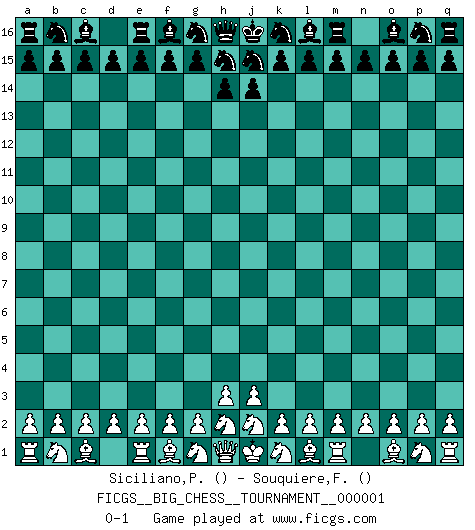 Last move : 0-1 2007 March 11 22:57:58 [Event "FICGS__BIG_CHESS__TOURNAMENT__000001"] [Site "FICGS"] [Date "2007.02.26"] [Round "1"] [White "Siciliano,Pablo"] [Black "Souquiere,Florence"] [Result "0-1"] [WhiteElo ""] [BlackElo ""] 0-1 Follow this game move after move (download)Fischer sacrificed virtually everything most of us weakies (to use his term) value, respect, and cherish, for the sake of an artful, often beautiful board game, for the ambivalent privilege of being its greatest master. (Paul Kollar) Das Schachspiel übertrifft alle anderen Spiele so weit wie der Chimborasso einen Misthaufen. (Arthur Schopenhauer) En el Ajedrez, tal como es jugado por los Maestros, practicamente la suerte es eliminada. (Emanuel Lasker) Le jeu d'échecs fait naître et fortifie en nous plusieurs qualités précieuses dans le cours de l'existence, telles que la prévoyance, la circonspection, la prudence, et la persévérance. (Benjamin Franklin - 1783, la morale des échecs) If everyone is thinking alike, then somebody isn't thinking. (US General George S. Patton)
