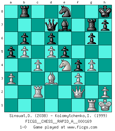 Last move : 1-0 2015 April 9 5:59:0 [Event "FICGS__CHESS__RAPID_A__000169"] [Site "FICGS"] [Date "2014.11.09"] [Round "1"] [White "Sinsuat,Datuali"] [Black "Kolomytchenko,Igor"] [Result "1-0"] [WhiteElo "2038"] [BlackElo "1999"] 1.e4 c5 2.Nf3 Nc6 3.d4 cxd4 4.Nxd4 Nf6 5.Nc3 d6 6.f3 a6 7.Be3 e5 8.Nb3 Be7 9.Be2 Be6 10.Nd5 Bxd5 11.exd5 Nb8 12.O-O Nbd7 13.Qd2 b6 14.c4 O-O 15.Rad1 a5 16.Nc1 Nh5 17.Nd3 f5 18.g3 Qe8 19.Kh1 Nhf6 20.a3 Qf7 21.b3 Nc5 22.b4 Ncd7 23.Nb2 Rfc8 24.b5 Rab8 25.Na4 g6 26.Bd3 Qe8 27.Qg2 Qd8 28.Qh3 Rb7 29.Bg1 R8c7 30.g4 f4 31.Rc1 Ne8 32.Nc3 Nc5 33.Bxc5 Rxc5 34.Rg1 Rc8 35.Ne4 Bg5 36.Qg2 Rf7 37.Qb2 Rg7 38.Qc2 Kh8 39.Qf2 Be7 40.Qg2 Qd7 41.Rc2 Rb8 42.Qf2 1-0 This chess game has been lost on time (started : 2014.11.09 12:3:48) Sicilian defense Kingside Castling by player White (move 12) Kingside Castling by player Black (move 14) Player White won this chess game. Follow this game move after move (download)The beauty of a move lies not in its' appearance but in the thought behind it. (Siegbert Tarrasch) Ich glaube, ich kenne inzwischen die Gründe für mein Versagen: schachliche Charakterfehler. Ich war nie ein Wunderkind und in meiner gesamten menschlichen Entwicklung immer zu langsam. (Viktor Kortschnoi) Creo que una cierta cantidad de temperamento es esperada de los genios del Ajedrez. (Ron Gross) Seul un grand joueur sait à quel point il joue faiblement. (Xavier Tartacover) He who defends everything defends nothing. (Frederick the Great)