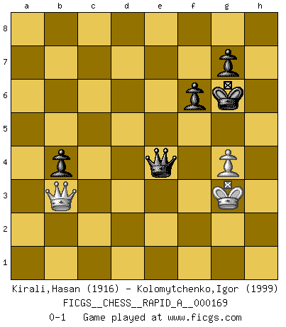 Last move : 0-1 2015 June 12 12:10:59 [Event "FICGS__CHESS__RAPID_A__000169"] [Site "FICGS"] [Date "2014.11.09"] [Round "1"] [White "Kirali,Hasan"] [Black "Kolomytchenko,Igor"] [Result "0-1"] [WhiteElo "1916"] [BlackElo "1999"] 1.e4 c5 2.Nc3 Nc6 3.Nf3 d6 4.d4 cxd4 5.Nxd4 Nf6 6.Bg5 e6 7.Qd2 Be7 8.O-O-O O-O 9.f4 h6 10.Bxf6 Bxf6 11.Ndb5 e5 12.g3 Bg4 13.Be2 Bxe2 14.Qxe2 a6 15.Rxd6 Qb8 16.Rxf6 axb5 17.Qg4 Qa7 18.Rxh6 Nb4 19.Rh5 Qf2 20.Qe2 Nxa2+ 21.Kd2 Rfd8+ 22.Nd5 Qd4+ 23.Qd3 Qxb2 24.fxe5 Nb4 25.Qc3 Qa2 26.Qxb4 Rxd5+ 27.exd5 Qxd5+ 28.Ke3 Qxh1 29.Qxb5 Qc1+ 30.Kf3 Qxc2 31.Rh4 Ra3+ 32.Kf4 Ra4+ 33.Kf3 Qc3+ 34.Kg2 Ra2+ 35.Kh3 Qc8+ 36.Rg4 Qf5 37.Qc4 Rc2 38.Qd5 Qf1+ 39.Kh4 Rxh2+ 40.Kg5 Rh6 41.Rf4 Rg6+ 42.Kf5 Qb1+ 43.Qe4 Qd1 44.Qf3 Qc2+ 45.Re4 Qh2 46.Qd1 Qh3+ 47.Rg4 f6 48.e6 Qh5+ 49.Kf4 Qe5+ 50.Kf3 Rxg4 51.Kxg4 Qe4+ 52.Kh3 Qxe6+ 53.g4 Qe3+ 54.Kg2 Qe4+ 55.Kg3 b5 56.Qb3+ Kh7 57.Qf7 b4 58.Qb3 Kg6 0-1 Sicilian : Closed, 2...Nc6 Queenside Castling by player White (move 8) Kingside Castling by player Black (move 8) 10 pieces endgame at move 50 : White KQPP , Black KQRPPP WHITE : King + 1 Queen 2 Pawns BLACK : King + 1 Queen 1 Rook 3 Pawns 9 pieces endgame at move 51 : White KQPP , Black KQPPP WHITE : King + 1 Queen 2 Pawns BLACK : King + 1 Queen 3 Pawns 8 pieces endgame at move 52 : White KQP , Black KQPPP WHITE : King + 1 Queen 1 Pawn BLACK : King + 1 Queen 3 Pawns Player Black won this chess game. Follow this game move after move (download)When in doubt... play Chess ! (Tevis) Zu meiner Zeit war ein 20 jähriger ein junger Spieler, heute ist er ein Veteran. (Garry Kasparov) a manera como él juega al Ajedrez, demuestra la completa naturaleza de un hombre. (Stanley Ellin) 'L'échange des dames est un coup dur pour les deux adversaires...' Un journaliste lors d'une partie du match Spassky-Fischer The only difference between a tax man and a taxidermist is that the taxidermist leaves the skin. (Mark Twain)