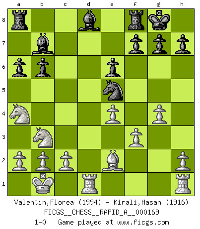 Last move : 1-0 2015 February 8 13:28:0 [Event "FICGS__CHESS__RAPID_A__000169"] [Site "FICGS"] [Date "2014.11.09"] [Round "1"] [White "Valentin,Florea"] [Black "Kirali,Hasan"] [Result "1-0"] [WhiteElo "1994"] [BlackElo "1916"] 1.e4 c5 2.Nf3 d6 3.d4 cxd4 4.Nxd4 Nf6 5.Nc3 a6 6.Bg5 Nc6 7.Qd2 Qb6 8.Nb3 e6 9.O-O-O Be7 10.f3 O-O 11.g4 Qc7 12.Bxf6 Bxf6 13.Qxd6 Qb6 14.Qc5 Qxc5 15.Nxc5 b6 16.Nb3 Bb7 17.Na4 Bd8 18.Be2 Ne5 19.Kb1 1-0 Sicilian : Najdorf, 6.Bg5 Queenside Castling by player White (move 9) Kingside Castling by player Black (move 10) Player White won this chess game. Follow this game move after move (download)If your opponent offers you a draw, try to work out why he thinks he's worse off. (Nigel Short) Nach Morphy wurde nichts neues mehr in der Behandlung offener Positionen gefunden. (Mikhail Moiseyevich Botvinik) Si el Ajedrez es una ciencia, es la mas inexacta. Si el Ajedrez es un arte, es demasiado inexacto para ser visto como tal. Si el Ajedrez es un deporte, es demasiado esotérico. Si el Ajedrez es un juego, es demasiado exigente para ser solo un juego. Si el Ajedrez es una aventura, es una muy demandante. Si el Ajedrez es una pasión, es una muy gratificante. Si el Ajedrez es la vida, es una muy triste. (Anónimo) On entre au jeu d'Echecs comme on entre en Religion. Pour le joueur d'Echecs, la partie d'Echecs c'est l'office, la messe, le défilé du 1er Mai, le dépôt de gerbe au Monument aux Morts. C'est un drame sacré. (Michel Roos) Optimism is a variety of information deficit. Sometimes especially true for correspondence chess games. (Michael Aigner)