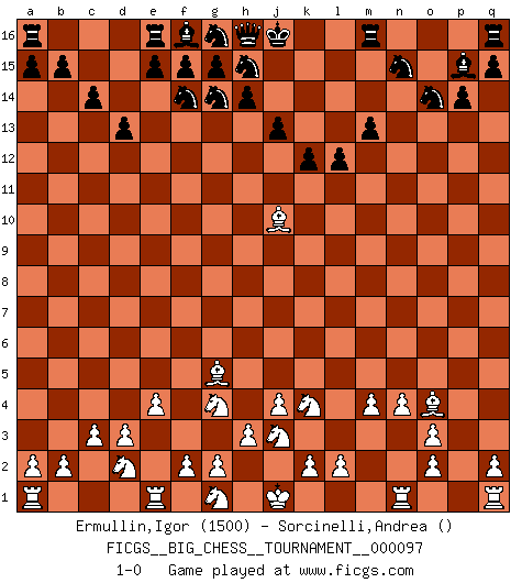 Last move : 1-0 2014 November 29 13:23:13 [Event "FICGS__BIG_CHESS__TOURNAMENT__000097"] [Site "FICGS"] [Date "2014.11.10"] [Round "1"] [White "Ermullin,Igor"] [Black "Sorcinelli,Andrea"] [Result "1-0"] [WhiteElo "1500"] [BlackElo ""] 1.h2-g4 k15-k13 2.n2-n4 l15-l13 3.o1-g8 j14-j13 4.g8-o15 p16-o14 5.o15-h9 l16-d9 6.j2-k4 c15-c14 7.m2-m4 d15-d13 8.e2-e4 d9-a12 9.f1-c4 k16-l14 10.j3-j4 c16-k9 11.d2-d3 p15-p14 12.c1-g5 o16-p15 13.c2-c3 b16-d15 14.h9-j10 k9-j10 15.c4-j10 d15-f14 16.h1-l4 l13-l12 17.b1-d2 a12-b13 18.l4-n6 j15-g14 19.n6-n15 l14-n15 20.p1-o3 b13-n2 21.m1-n1 n2-o3 22.p2-o3 m15-m13 23.l1-o4 k13-k12 24.k1-j3 1-0 Follow this game move after move (download)Every Chess master was once a beginner. (Chernev) Den Ruhm habe ich schon, jetzt brauche ich noch das Geld. (Wilhelm Steinitz) Solo existe una cosa que Fischer hace en el Ajedrez sin placer: ¡perder!. (Boris Spassky) Les erreurs sont comme les malheurs, elles n'arrivent jamais seules. (Siegbert Tarrasch) A computer lets you make more mistakes faster than any invention in human history - with the possible exceptions of handguns and tequila. (Mitch Ratcliffe)