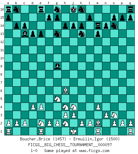 Last move : 1-0 2015 February 24 17:15:43 [Event "FICGS__BIG_CHESS__TOURNAMENT__000097"] [Site "FICGS"] [Date "2014.11.10"] [Round "1"] [White "Boucher,Brice"] [Black "Ermullin,Igor"] [Result "1-0"] [WhiteElo "1457"] [BlackElo "1500"] 1.e2-e4 h15-g13 2.f1-c4 n15-n14 3.j2-h4 j15-k13 4.h2-j4 h16-o10 5.p1-o3 o16-g9 6.h1-m5 c15-c14 7.n2-n3 d15-d13 8.b1-c3 k15-k14 9.d2-d4 l16-k15 10.o1-j6 k15-o11 11.j6-o11 o10-o11 12.m2-m4 m15-m13 13.l1-m2 e15-e13 14.g1-f3 f16-c13 15.c4-e2 c16-l8 16.c1-h6 p16-o14 17.k1-h2 m16-m14 18.m5-b5 b15-b14 19.f3-g5 l8-e2 20.b5-e2 o11-e2 21.c3-e2 1-0 Follow this game move after move (download)A man that will take back a move at Chess will pick a pocket. (Richard Fenton) Wenn ich Weiß habe gewinne ich weil ich Weiß habe, wenn ich Schwarz habe gewinne ich weil ich Bogoljubov bin. (Efim Bogoljubov) Creo que una cierta cantidad de temperamento es esperada de los genios del Ajedrez. (Ron Gross) Echiquier : carré parfait, comme la Jérusalem nouvelle décrite par l'auteur de l'Apocalypse, huit cases sur huit, exaltation du chiffre 4, symbole du cosmos aux quatre horizons... où le noir et le blanc, l'ombre et la lumière, le mal et le bien s'entremêlent et se conjuguent. (Robert Couffignal, Le Gambit du poète) Do not put your faith in what statistics say until you have carefully considered what they do not say. (William W. Watt)