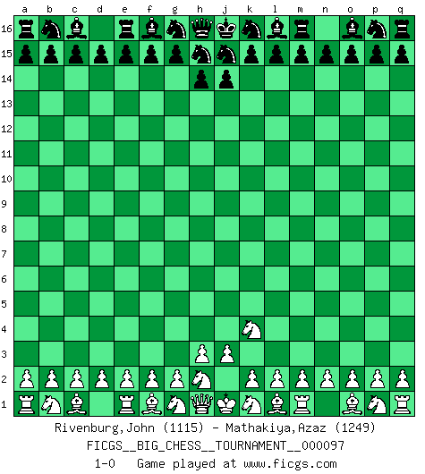 Last move : 1-0 2014 November 11 5:41:40 [Event "FICGS__BIG_CHESS__TOURNAMENT__000097"] [Site "FICGS"] [Date "2014.11.10"] [Round "1"] [White "Rivenburg,John"] [Black "Mathakiya,Azaz"] [Result "1-0"] [WhiteElo "1115"] [BlackElo "1249"] 1.j2-k4 1-0 Follow this game move after move (download)Bobby Fischer's current state of mind is indeed a tragedy. One of the world's greatest Chess players - the pride and sorrow of American Chess. (Frank Brady) Im Hotelzimmer gab es nur zwei Schaben. (Über die Turnierbedingungen) (Peter Swidler) Vive, pierde y aprende al observar a tu oponente como gana. (Amber Steenbock) Il a essayé de se convaincre qu'il pourrait empêcher toutes les erreurs et ne jamais perdre. L'horreur ! Gary Kasparov au sujet de Robert Fischer. The age of a woman doesn't mean a thing. The best tunes are played on the oldest fiddles. (Ralph Waldo Emerson)