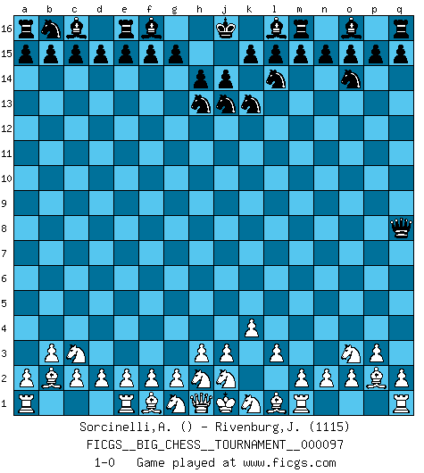 Last move : 1-0 2014 December 18 14:8:41 [Event "FICGS__BIG_CHESS__TOURNAMENT__000097"] [Site "FICGS"] [Date "2014.11.10"] [Round "1"] [White "Sorcinelli,Andrea"] [Black "Rivenburg,John"] [Result "1-0"] [WhiteElo ""] [BlackElo "1115"] 1.k2-k4 j15-k13 2.p2-p3 h16-q8 3.l2-l3 k16-l14 4.o1-p2 h15-j13 5.p1-o3 g16-j15 6.b2-b3 j15-h13 7.c1-b2 p16-o14 8.b1-c3 1-0 This big chess game has been lost on time (started : 2014.11.10 17:0:21) Follow this game move after move (download)A good sacrifice is one that is not necessarily sound but leaves your opponent dazed and confused. (Rudolph Spielmann) Wir irren allesamt, nur jeder irrt anders. (Georg Christoph Lichtenberg) Hay jugadores fuertes y personas amables y yo soy un jugador fuerte. (Bobby Fischer) Toutes les manuvres exécutées sur une colonne ouverte ont pour but ultime l'intrusion définitive sur la septième ou la huitième rangée, en plein cur de la position ennemie. (Aaron Nimzovitch) War is the child of passion, passion is the child of narcissism and narcissism is the child. (...) Another game ? (Thibault de Vassal)