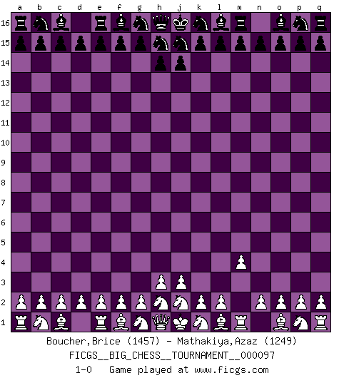 Last move : 1-0 2014 November 22 4:0:3 [Event "FICGS__BIG_CHESS__TOURNAMENT__000097"] [Site "FICGS"] [Date "2014.11.10"] [Round "1"] [White "Boucher,Brice"] [Black "Mathakiya,Azaz"] [Result "1-0"] [WhiteElo "1457"] [BlackElo "1249"] 1.m2-m4 1-0 Follow this game move after move (download)It is the aim of the modern school, not to treat every position according to one general law, but according to the principle inherent in the position. (Richard Reti) Ich möchte Schüler heranbilden, die das Vermögen haben, selbst zu denken und Kritik zu üben. (Emanuel Lasker) El Ajedrez es un terrible juego. Si no controlas el centro, tu oponente tiene una posición mas holgada. Si tienes control del centro, ¡entonces realmente tu tienes algo de que preocuparte!. (Siegbert Tarrasch) Le système Elo représente seulement une moyenne. Il est simplement un indicateur de votre stabilité. (Anatoli Karpov) Faith : not wanting to know what is true. (Friedrich Nietzsche)