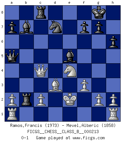 Last move : 0-1 2015 March 8 4:40:27 [Event "FICGS__CHESS__CLASS_B__000213"] [Site "FICGS"] [Date "2014.11.12"] [Round "1"] [White "Ramos,Francis"] [Black "Mevel,Alberic"] [Result "0-1"] [WhiteElo "1973"] [BlackElo "1858"] 1.e4 c5 2.Nf3 e6 3.d4 cxd4 4.Nxd4 Nf6 5.Nc3 Nc6 6.Bg5 h6 7.Be3 Bb4 8.Qd3 O-O 9.f3 d5 10.Nxc6 bxc6 11.Bd4 c5 12.Be5 Nd7 13.Bd6 c4 14.Qd4 Bxd6 15.exd5 Be5 16.Qxc4 exd5 17.Qxd5 Rb8 18.Bd3 Rxb2 19.Ne4 Bb7 20.Qc4 Qa5+ 21.Ke2 Rc8 0-1 Sicilian : Anderssen variation Kingside Castling by player Black (move 8) Player Black won this chess game. Follow this game move after move (download)Bobby is the finest Chess player this country ever produced. His memory for the moves, his brilliance in dreaming up combinations, and his fierce determination to win are uncanny. (John Collins) Nur ein wirklich starker Spieler weiß wie schwach er spielt. (Savielly Grigorievitsch Tartakower) En el Ajedrez, cuando menos, el valiente hereda la tierra. (Edmar Mednis) Soyez une menace à chaque fois que vous vous asseyez pour jouer. (Ken Smith) I don't believe in psychology. I believe in good moves. (Bobby Fischer)